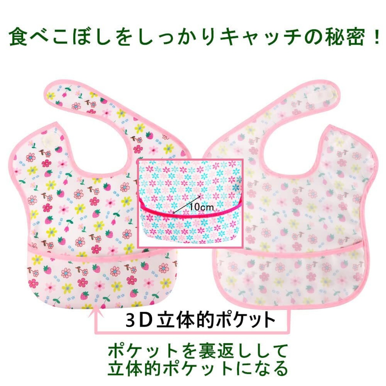 立体的ポケット仕様ベビーエプロン:裏返しタイプの食事エプロン。食べこぼしをしっかりキャッチ。スタイ型でそのまま使うと離乳食スタイ、ポケットが裏返しすると食事エプロン。2way使えるの食事スタイ。