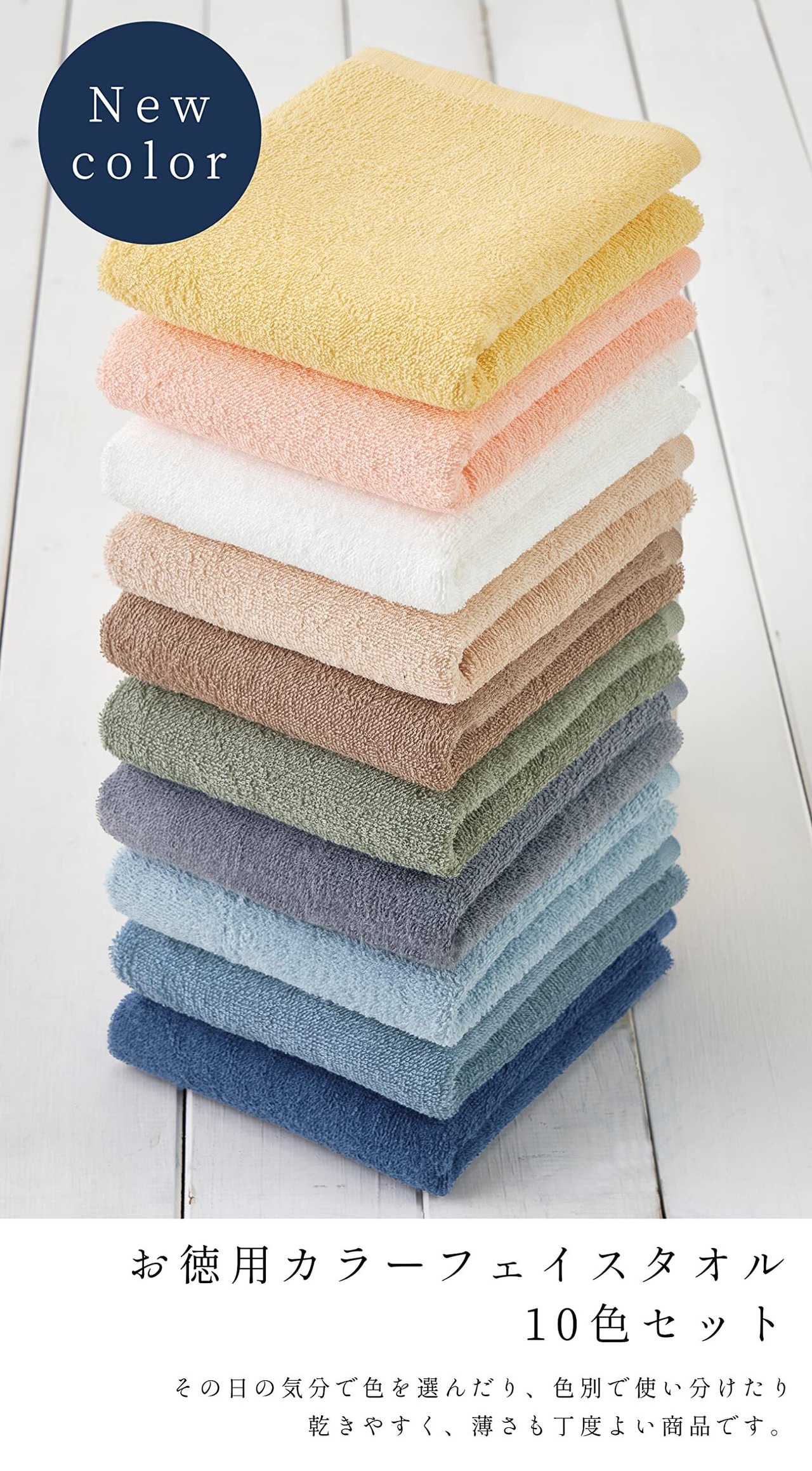 【お得な10枚セット!】: 10色各1枚入りのセットは、使い分けや贈り物にも最適。カラフルなタオルを日替わりで楽しむことで、日々の気分をリフレッシュさせてくれます。まとめて購入することで、長くお使いいただくことができます。