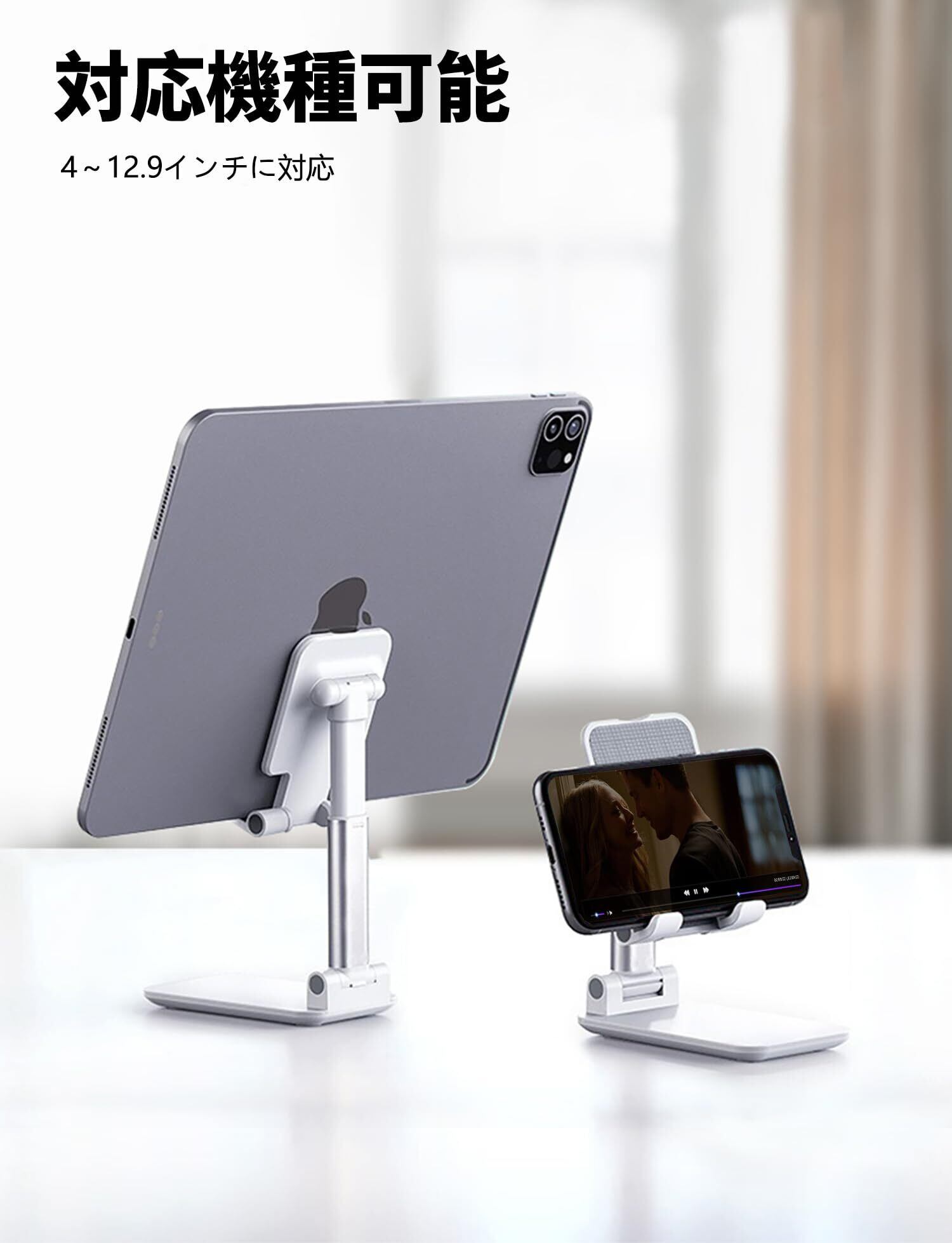 【対応機種】4インチ(スマホ)から9インチ(タブレット)の端末に対応しています。厚さが12mm以下であればスタンドに載せられます。(800g以下のデバイスをお勧めです)