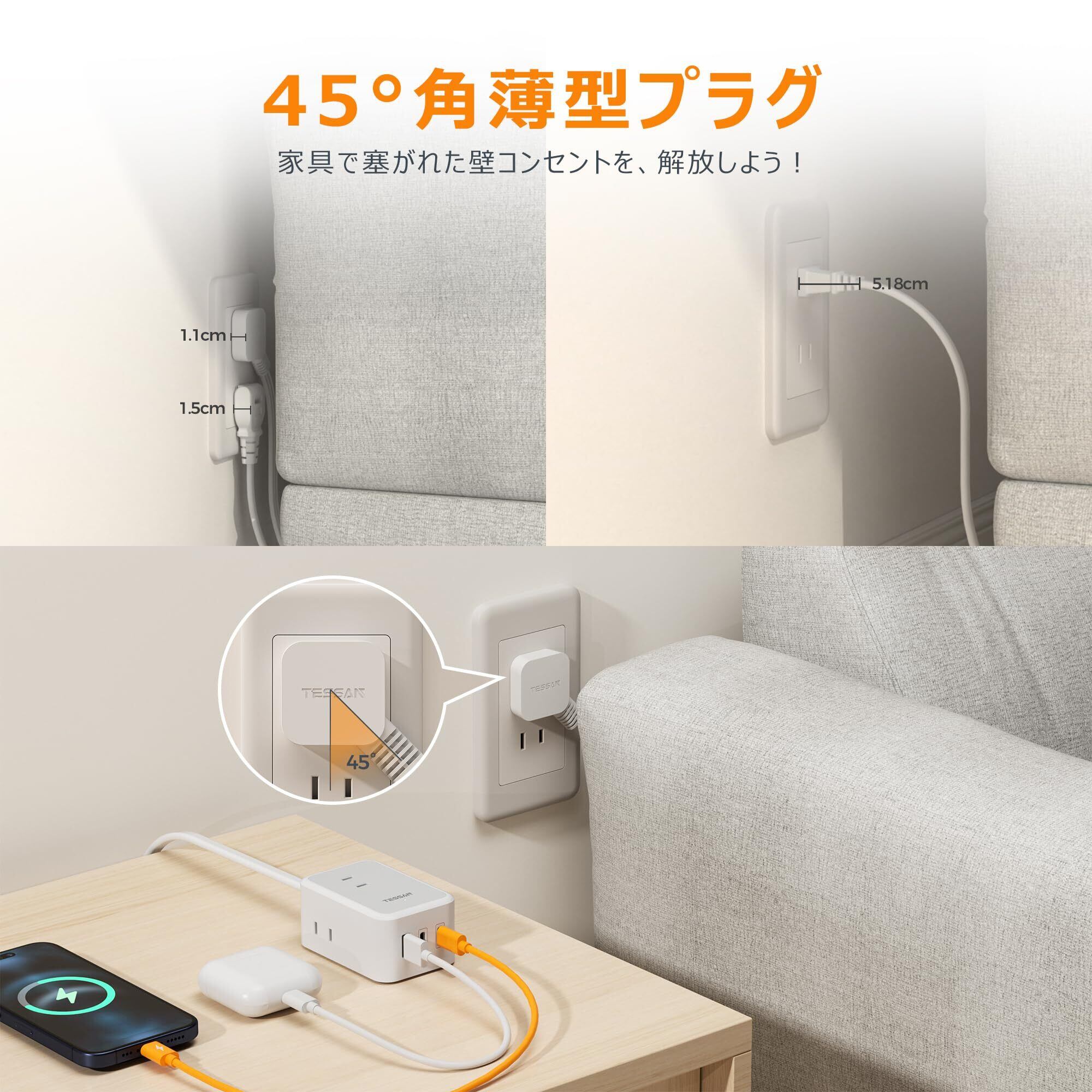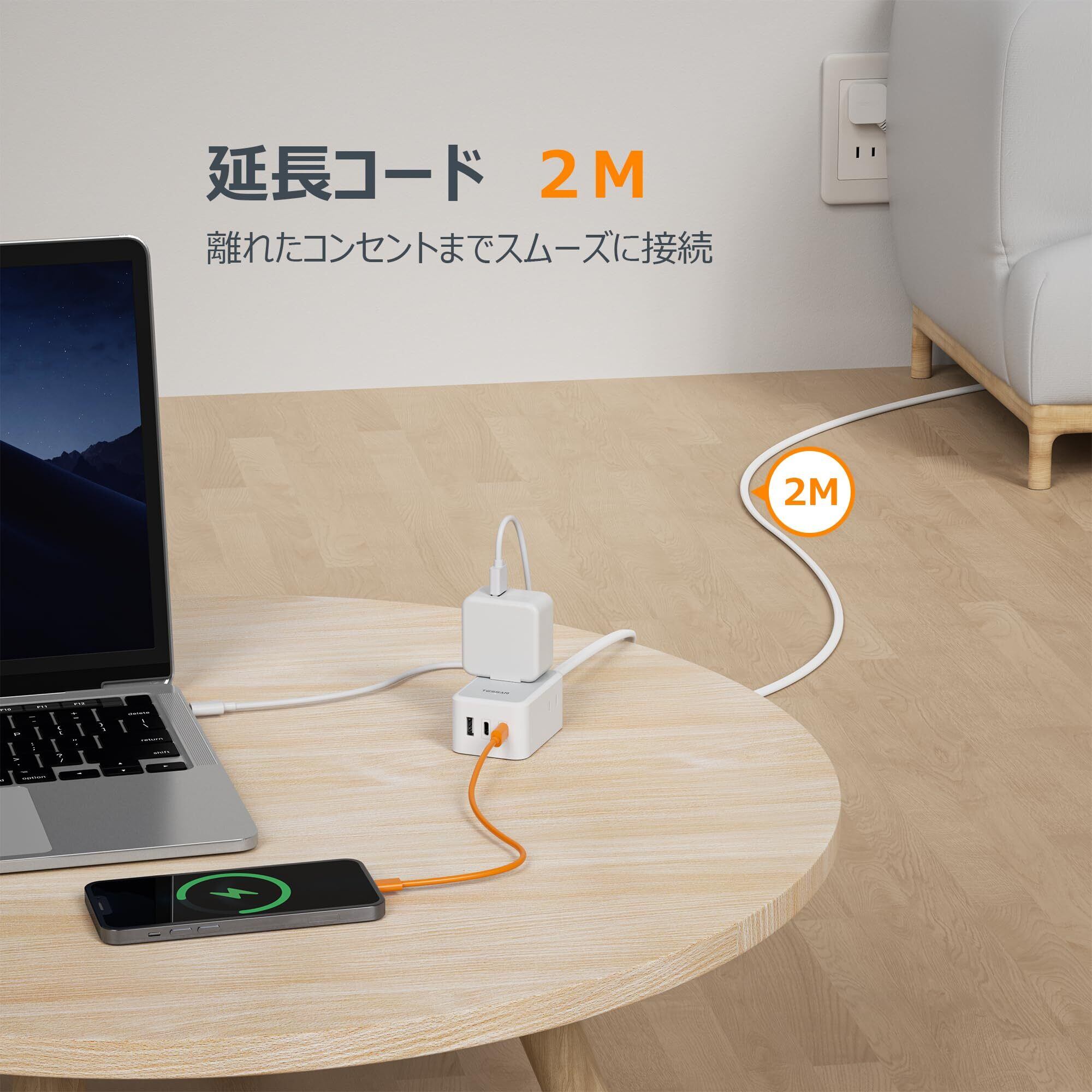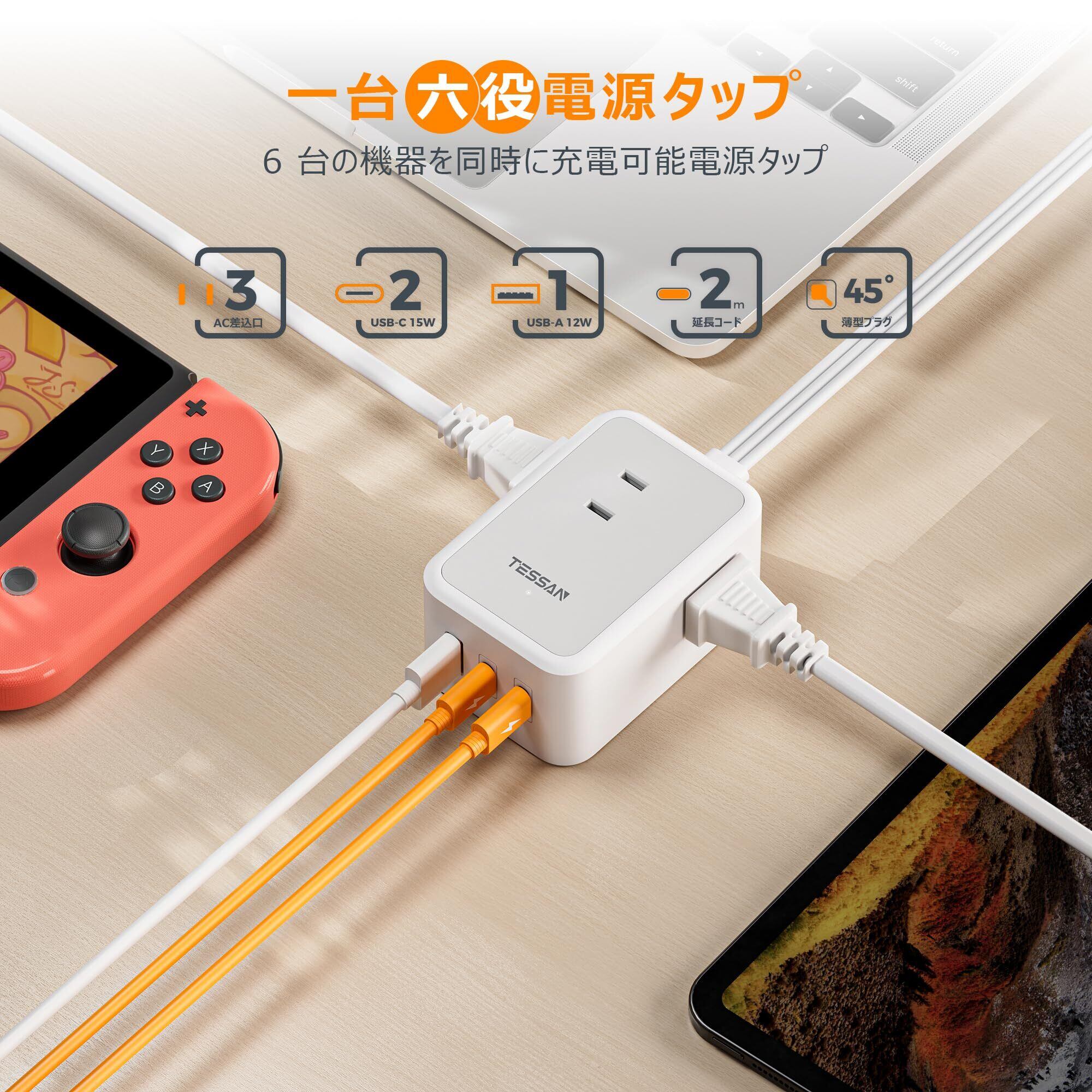 延長コード 2m 薄型 電源タップ usb コンセントタップ たこあしコンセント テーブルタップ TESSAN 3個AC 2個タイプC 1個タイプA 電源コード type-c タコ足配線 隙間