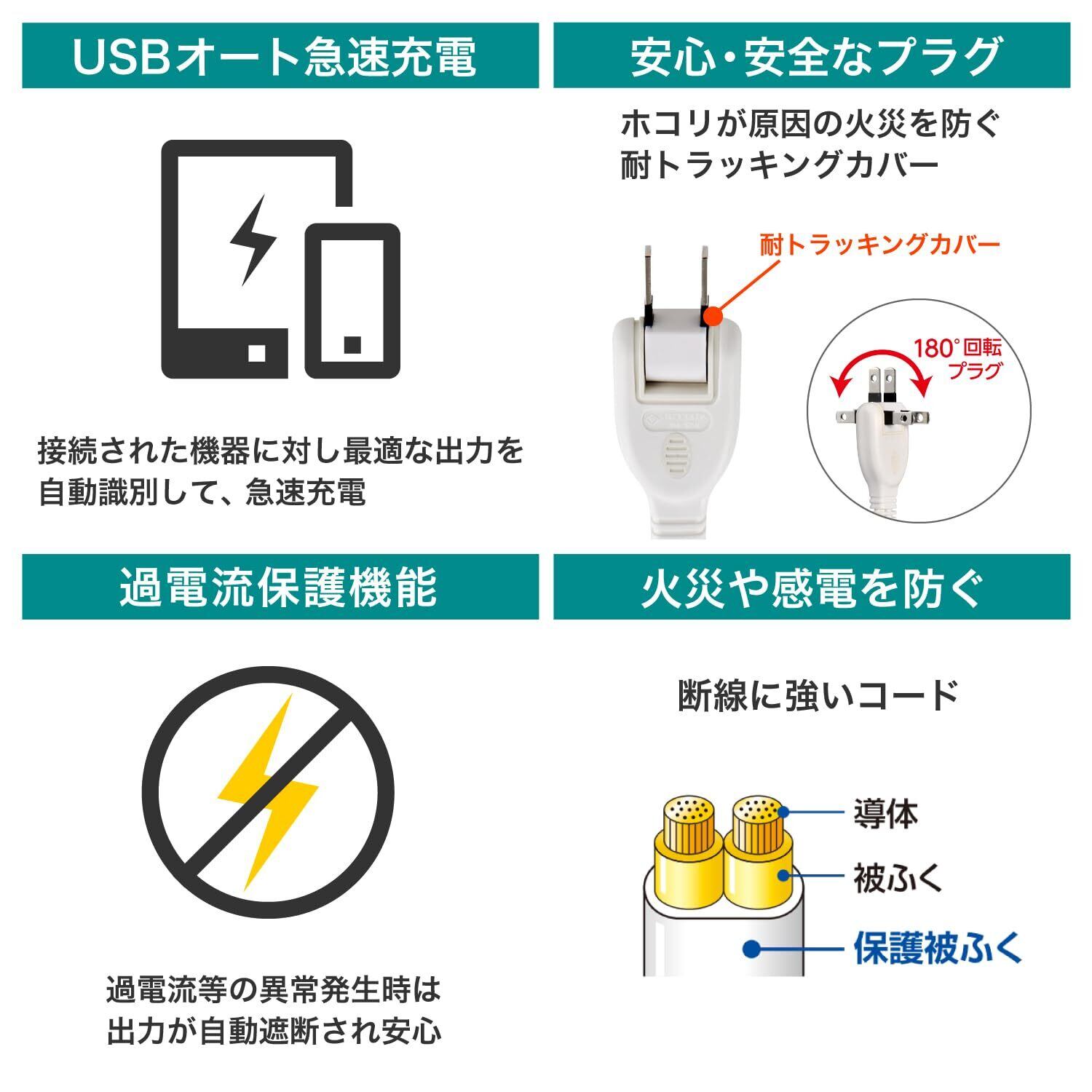 接続された機器(iPhone、iPad、Android等)に対し、最適な出力を自動識別し、急速充電する自動識別機能