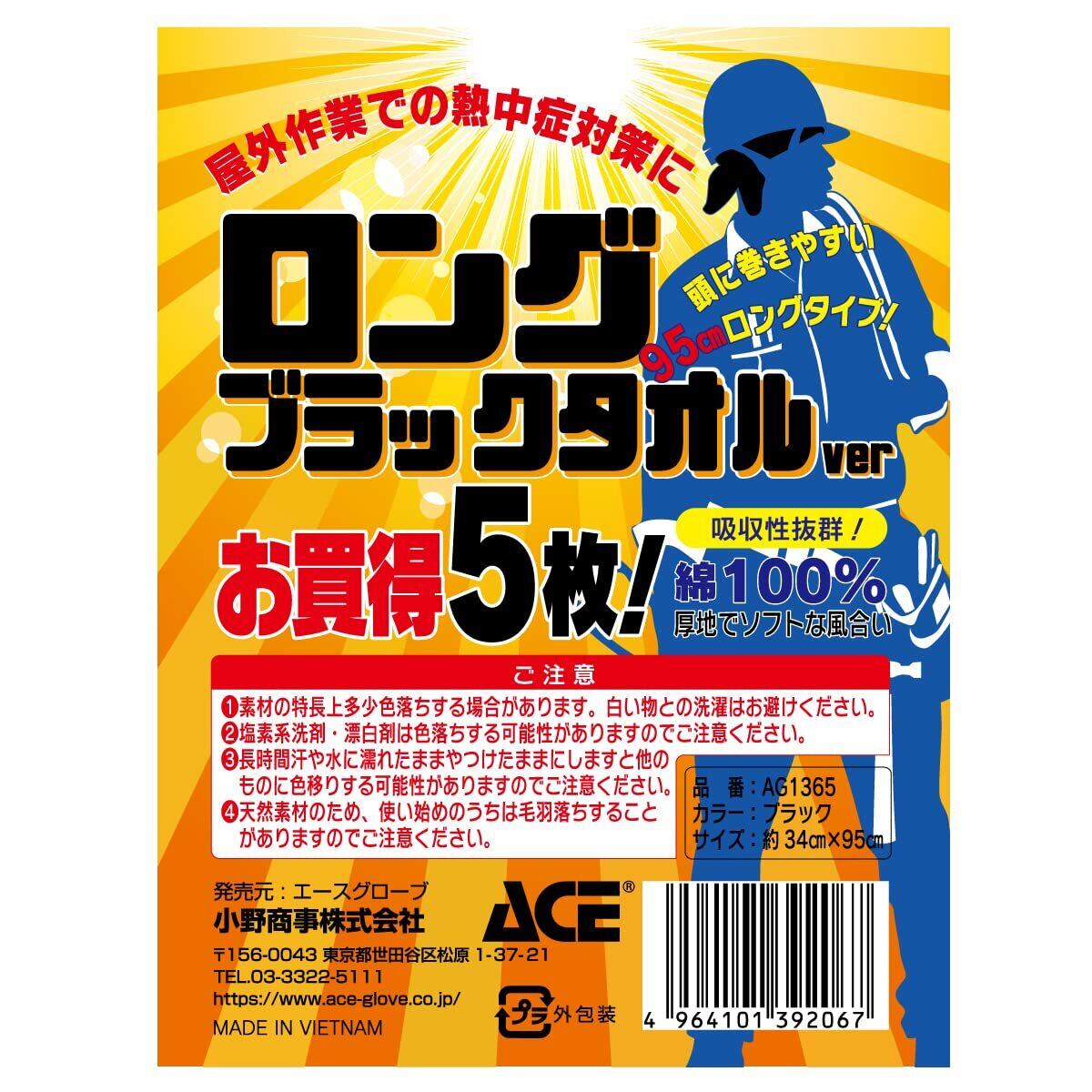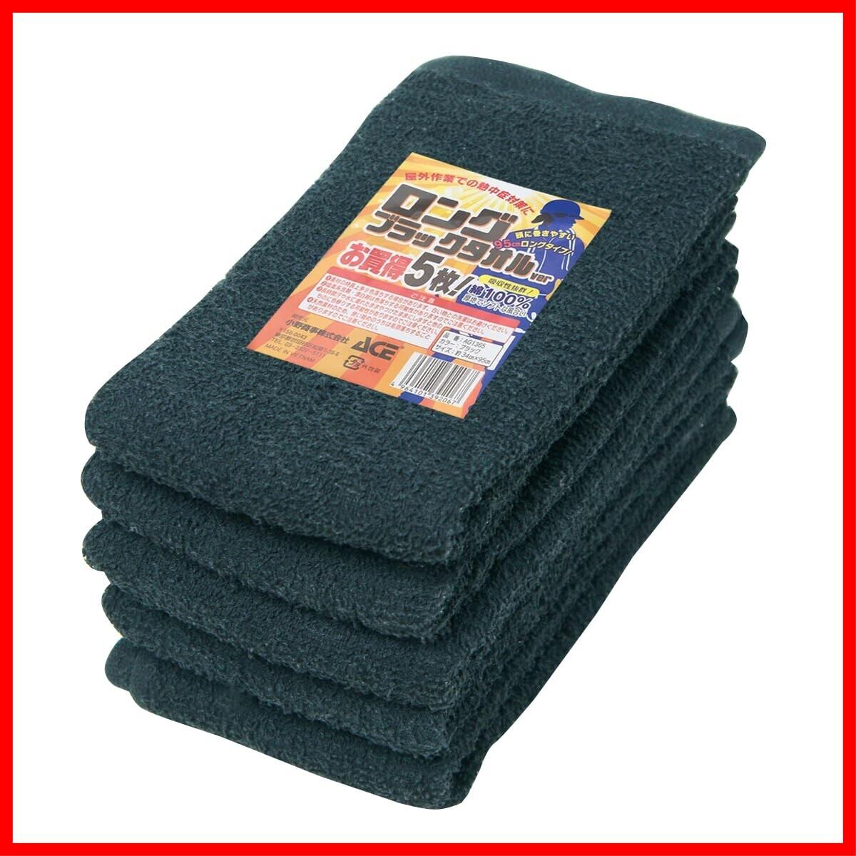 エース 業務用タオル ロング丈 黒5枚組 200匁相当 約34cm×95cm AG1365