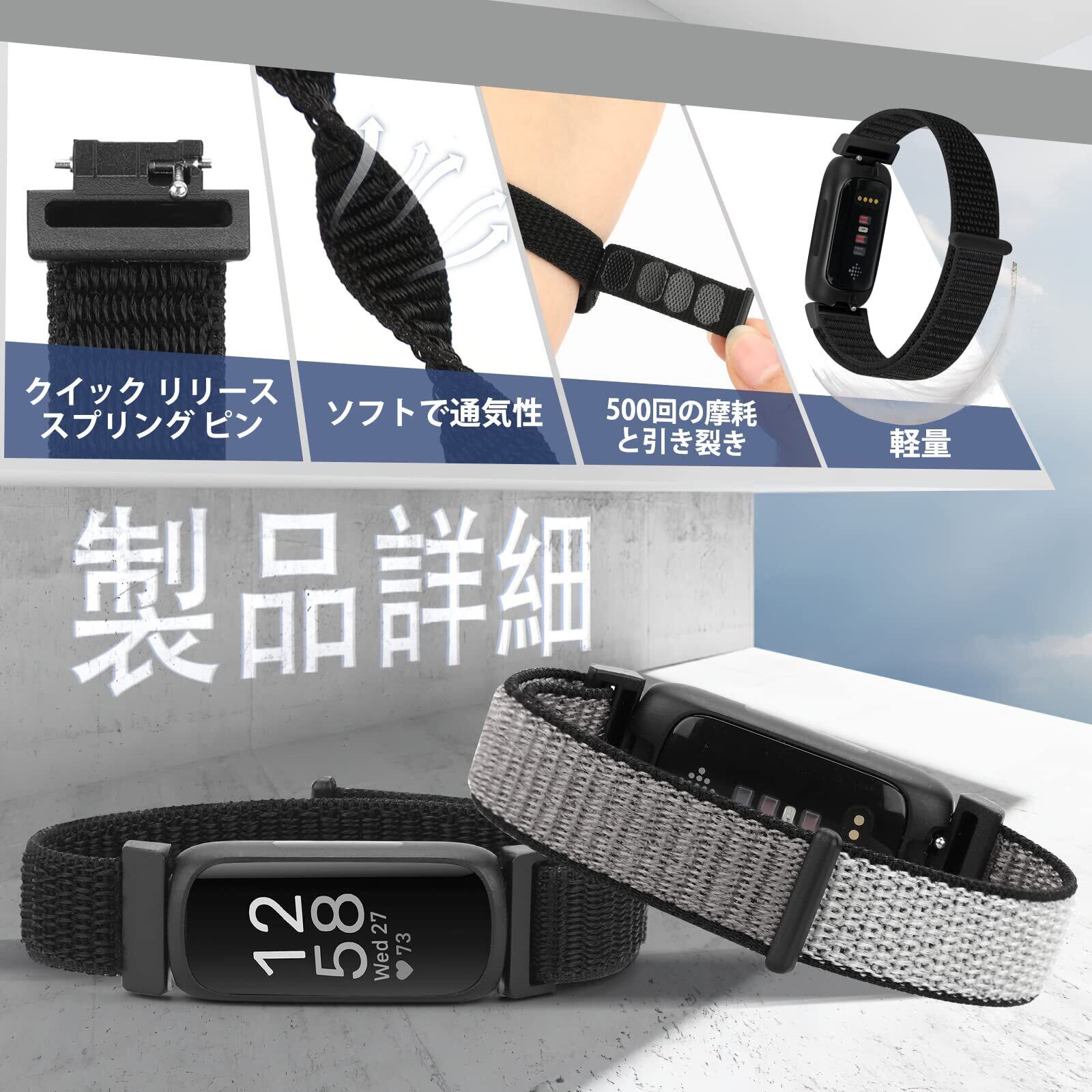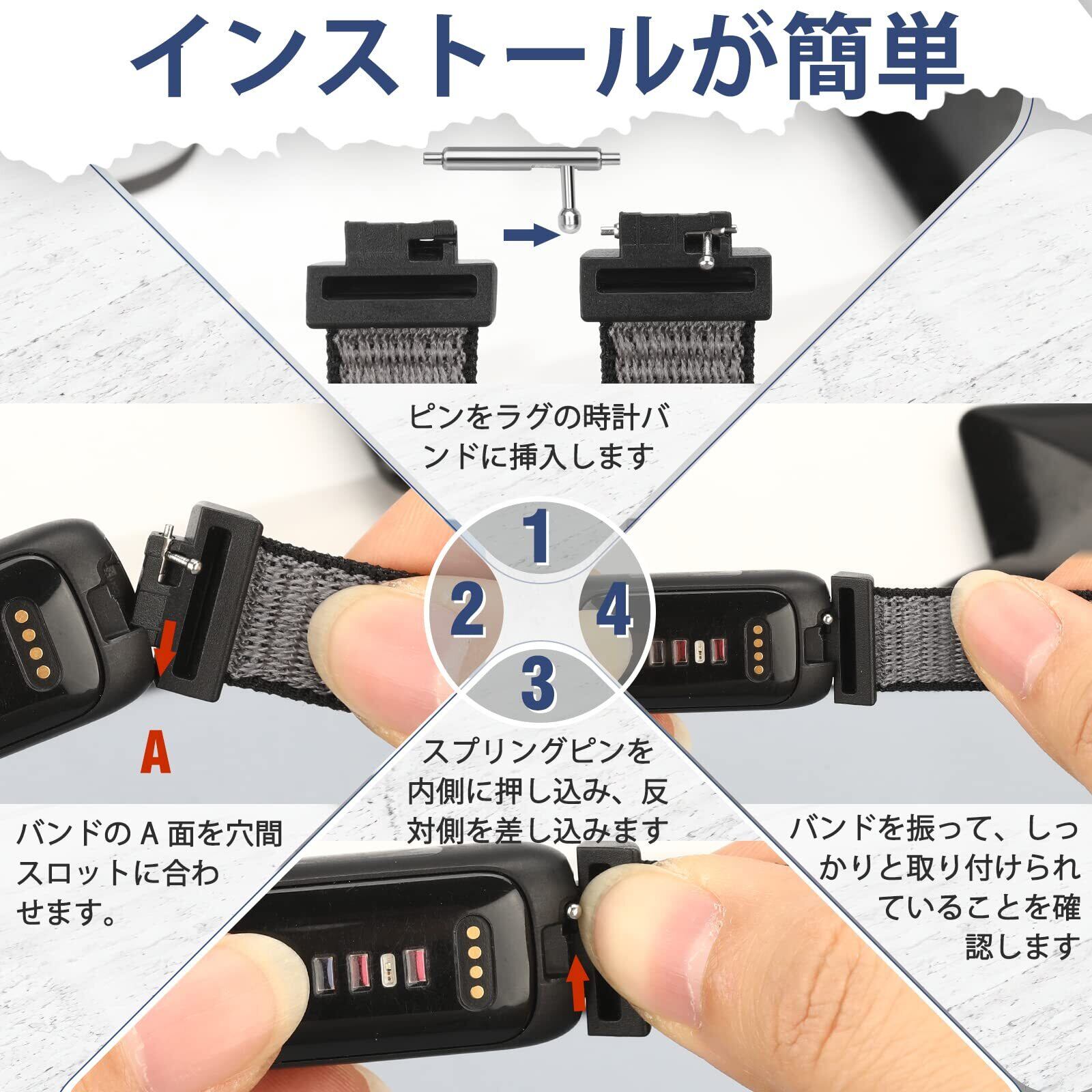 【取り付けと取り外し】--- inspire 3 スポーツ ウォッチ バンドは、両端にクイック リリース スプリング バーが付いており、時計のインターフェイスに正確かつ安全にロックされます。 ナイロンバンドの脱落や緩みを効果的に防ぎます。 余分なツールは必要ありません。
