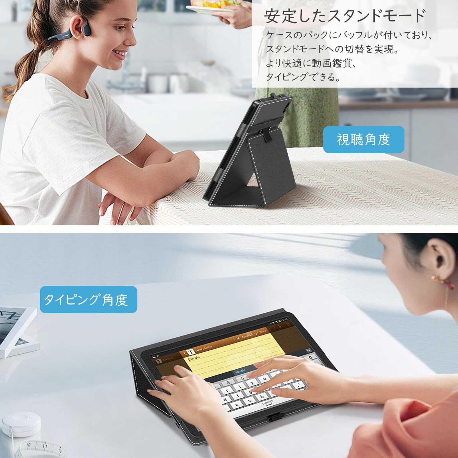 「PUレザー表面素材」 C108/C107/OC101ケースの表面は上質なPUレザー素材を採用しており、手触りが良く、不意の扱いに落下しても衝撃を有効的最小限に抑えられて、タブレット本体を傷つきや汚れからしっかりと保護できます。裏は柔軟なマイクロファイバー生地を採用し、画面をスクラッチなどから優しく守ってくれます。