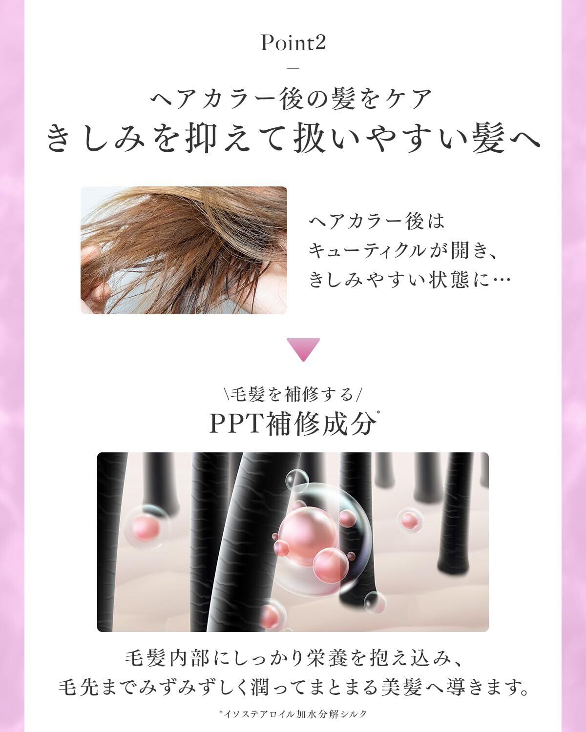 ✨【 内×外のW補修 】「内側に浸透する補修成分*¹」と「表面を保護する成分*²」のW補修処方。毛髪の内密度を高め、パサつかずカラーが映える艶髪へ導きます。(*¹イソステアロイル加水分解シルク・ラウロイル加水分解シルクNa、*²ポリクオタニウム-10)