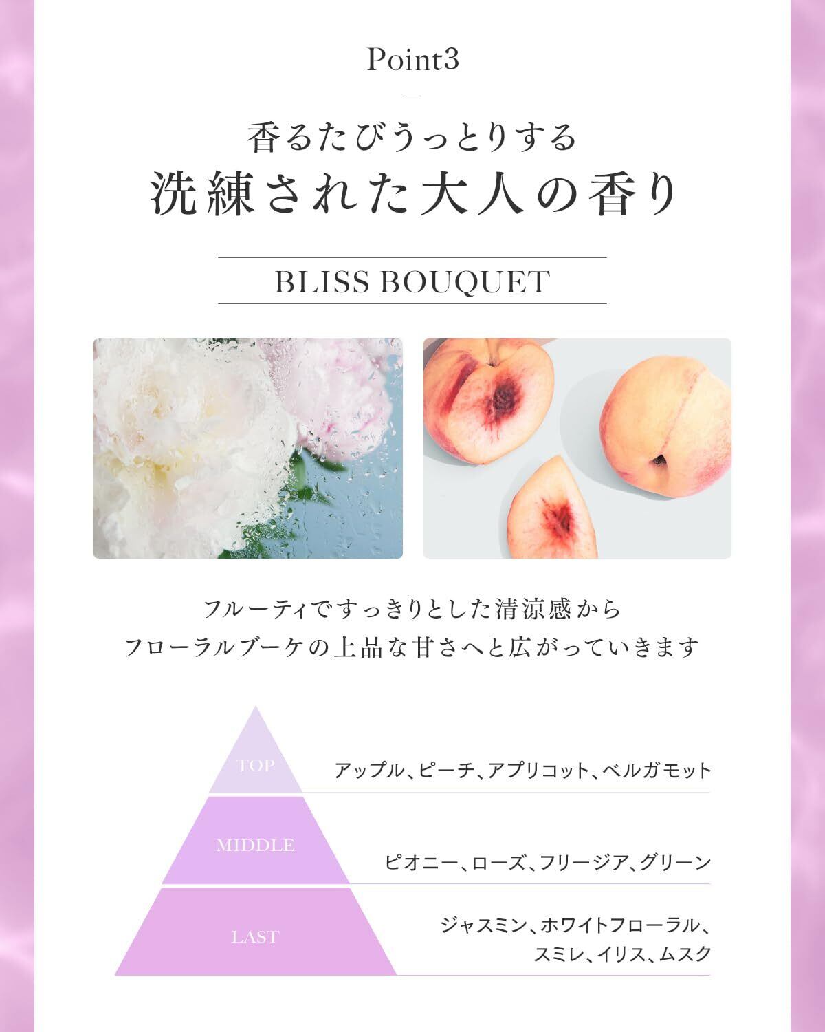✨【 洗練された大人の香り ~フルーティ・フローラル~ 】□TOP:アップル・ピーチ・アプリコット・ベルガモット □MIDDLE:ピオニー・ローズ・フリージア・グリーン □LAST:ジャスミン・ホワイトフローラル・スミレ・イリス・ムスク