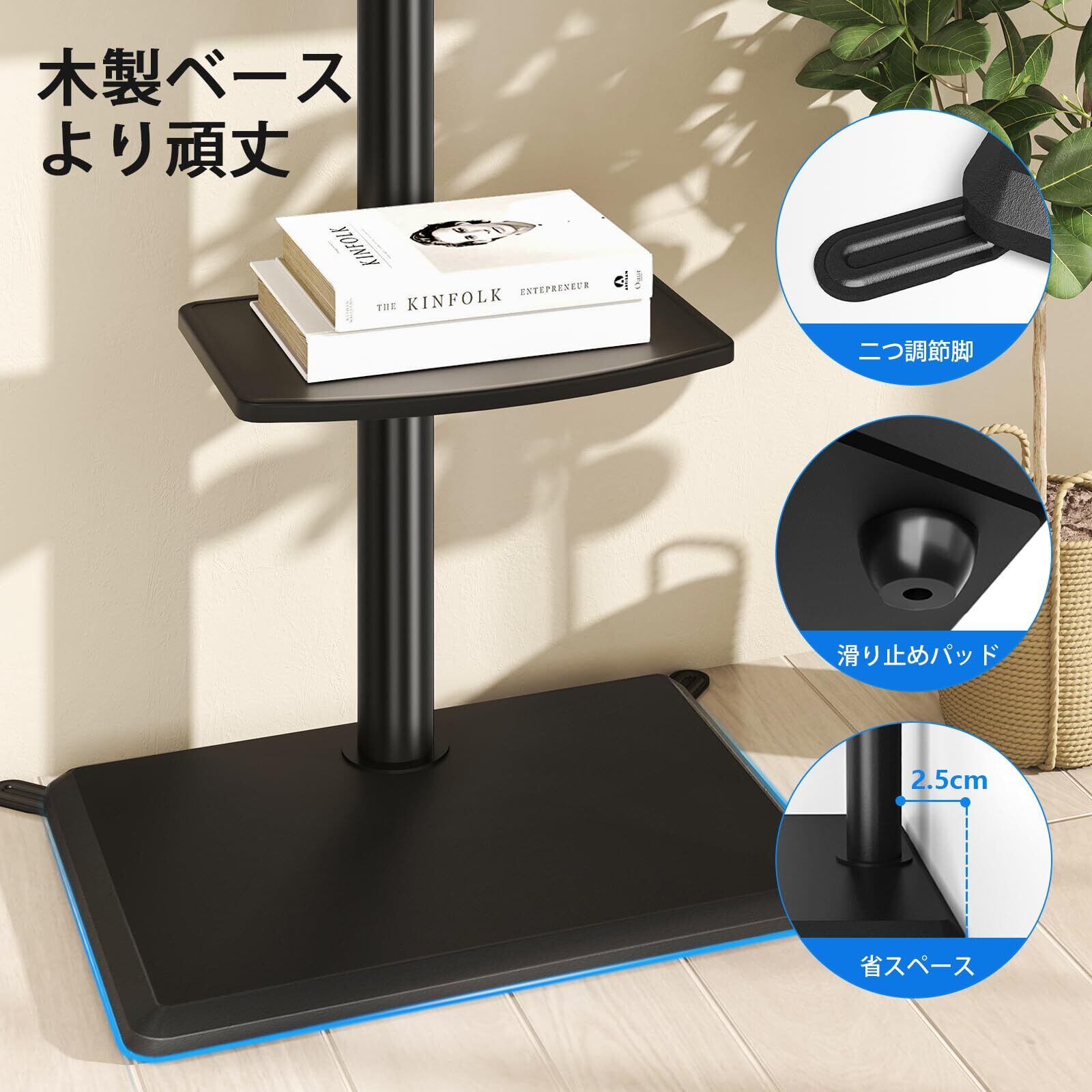木製ベース、調節脚:壁寄せテレビスタンドの台座は木製で、ガラスより安全で地震時壊れることをご心配なく。直接壁に寄せて置いてあるいは調節足を開いて様々な場合で使用できます、ワイヤなども要らないで、とても安全です。