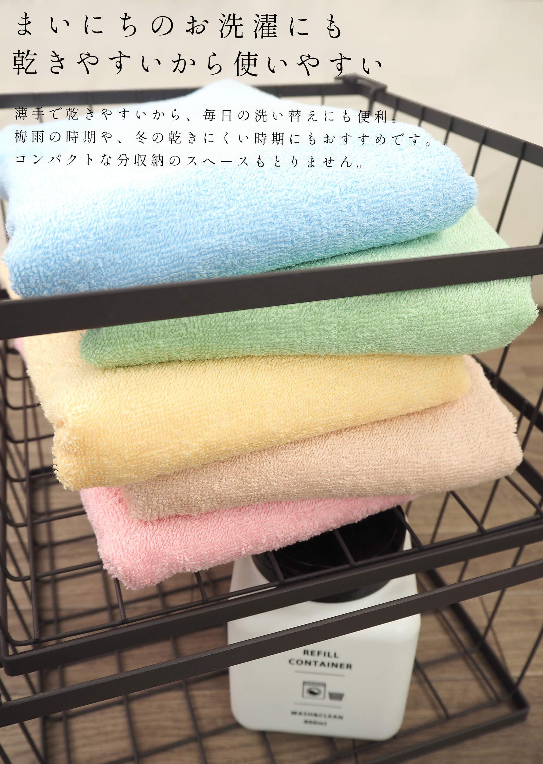 気軽にデイリー使いしやすいセット組。薄手で軽やか、5枚まとめてコスパ抜群です。これ一つでバスタオル不足を解消できる、5枚セットです。