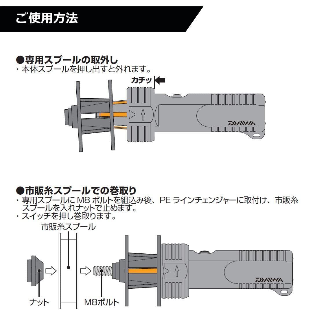 ダイワ(DAIWA) 専用スプール付PEラインチェンジャー!!更に便利!PEラインチェンジャー本体と専用スプールのセット。PEラインチェンジャーに専用スプール(ブラック)をセット。ラインの巻替え、裏返しや保管、塩抜きにも使用可能。付属のボルト、ナットを使用し市販糸スプールも装着可能。