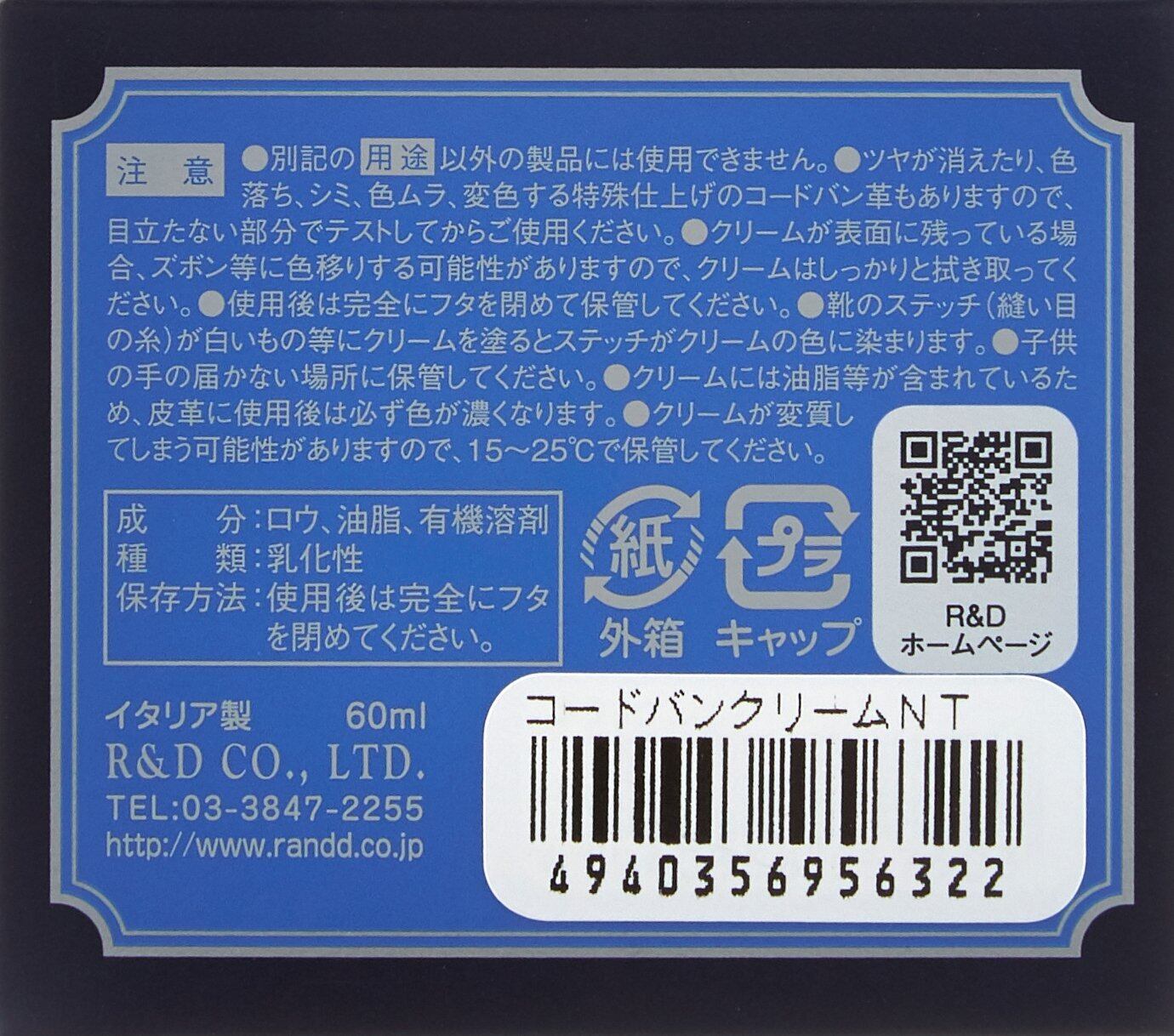 ・特殊なカラーワックス配合によりコードヴァンの色を鮮やかに蘇らせて補色します。・保革(栄養)効果や美しい光沢感を出すことでコードヴァンが本来放つツヤをしっかりと出します。着色力が強く革に色がうまく乗るので、ガラスレザー等の通常の乳化性クリームが浸透しにくい革の補色にもお使い頂けます。■用途:コードヴァン(コードバン)の補色・栄養・ツヤ出し、ガラスレザーの補色・ツヤ出し■タイプ:乳化性クリーム ガラスビン入り■容量:60ml ■原産国:イタリア製 ■カラー:全7色(ブラック・ニュートラル・Mブラウン・Dブラウン・Lブラウン・ネイビー・バーガンディ)■注意:用途以外の製品には使用できません。必ず目立たない部分でテストしてからご使用下さい。