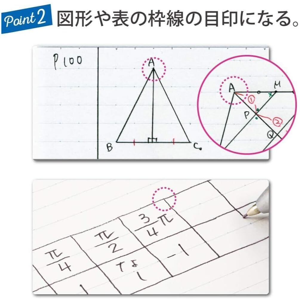 ●罫線上に等間隔に並んだドットを活用することで、ノートを美しく書くことができ、書いた後見返しやすく、効率的に学習することができます。