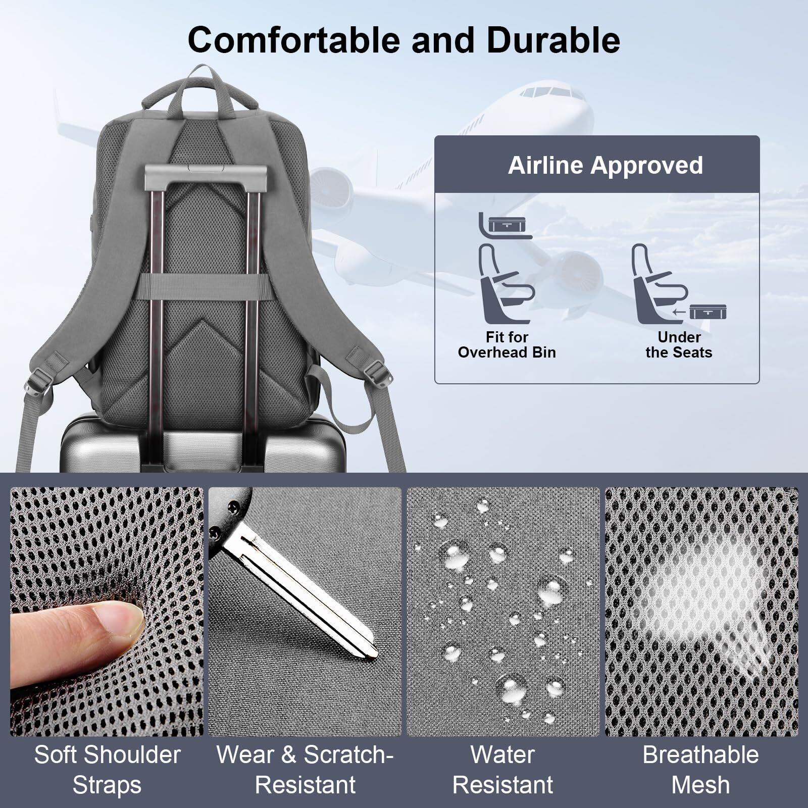 「防水&丈夫」オックスフォード素材デザインで、耐衝撃性、耐摩耗性でバッグ本体も耐久性があり、荷物をしっかり保護します。雨などの水を弾く撥水加工生地なので軽い雨や水などをこぼしても大丈夫です。また、ベルトや背中は通気性のよいメッシュ素材を採用。負担を軽減させ、最高の背負い心地を実現。長時間使っても、背中の乾燥保持します。その上、背面部分にはスーツケースとセットできる構造になっており、持ち歩くのに便利で、出張や旅行では重宝します。