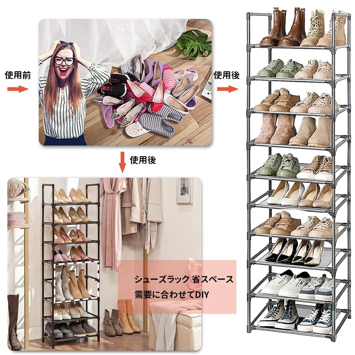 【省スペース 大容量のシューズラック ブラック】サイズ:幅約45×奥行30×高さ176cm,靴ラックは、全10段で、靴を16-20足収納できます。収納スペースが狭く、靴が多い方に、この靴ラックは非常に好適です。フットプリントが小さいため、靴ラックはスペース効率が非常に高く、すべてのコーナーに適しています。