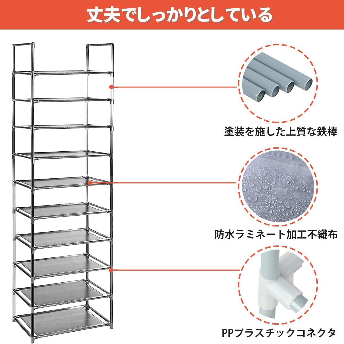 【シューズラック 丈夫でしっかりとしている】この靴ラックは塗装を施した上質な鉄棒と防水ラミネート加工不織布が使われています。①シューズラック 鋼管-直径13mmのプラスチック 塗装を施した上質な鉄棒は、錆びることがなく、腐食してしまうこともありません。②防水ラミネート加工不織布-防水仕様で通気性も良く、洗濯しやすく、長く使用することができます。③高強度環境配慮型PPプラスチックコネクタ-耐久性があります、変形しにくいです。