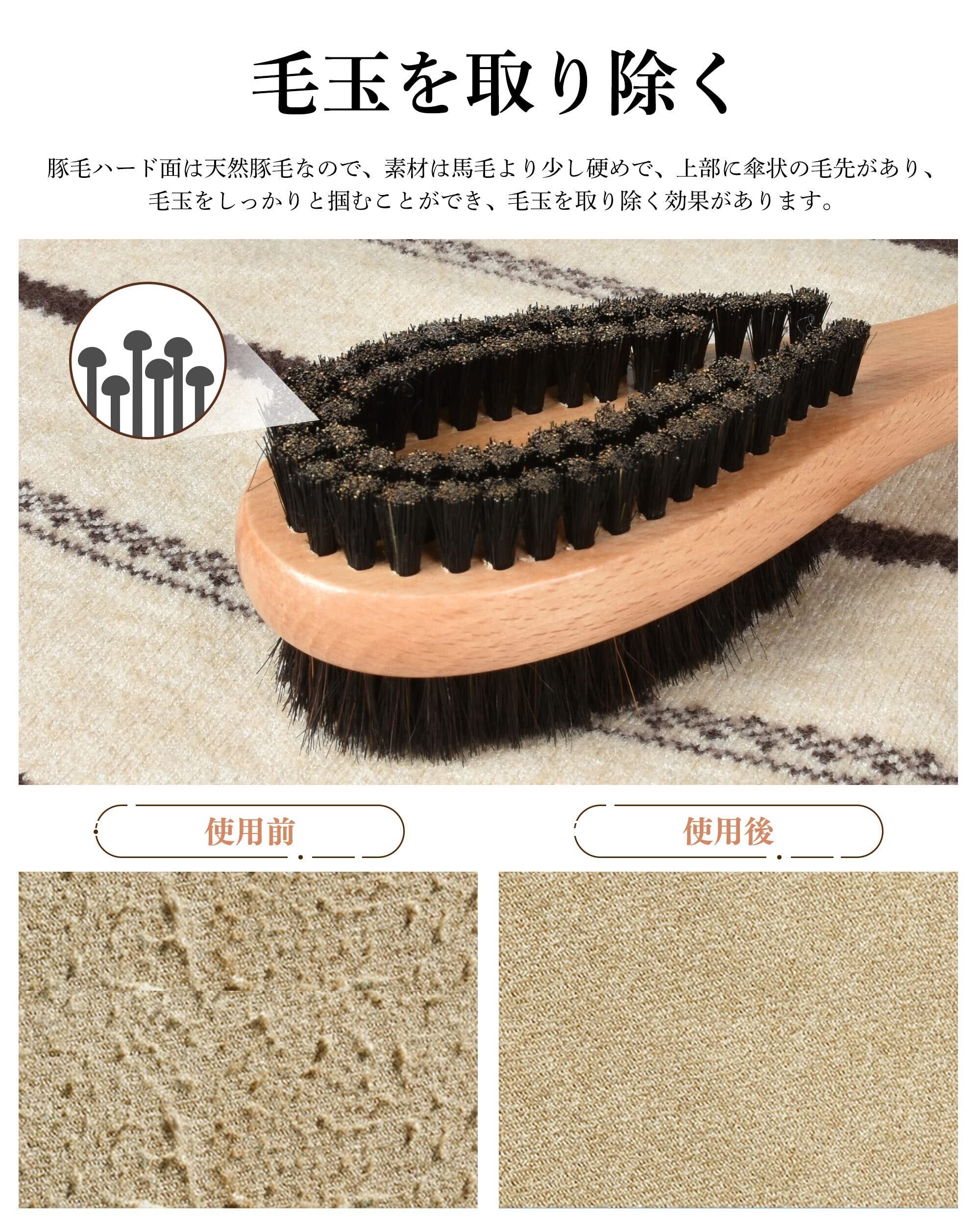 【洋服ブラシ|両面対応】両面タイプで多用途に適しています。「馬毛ソフト面」は花粉や埃除去、洋服、帽子、布団などの静電気を取り除くことができますし、カバン、靴など革製品のお手入れと表面の掃除もできます。また、 繊維も整えられるので毛玉が予防できます。「豚毛ハード面」は毛玉等を取り除きことができます。