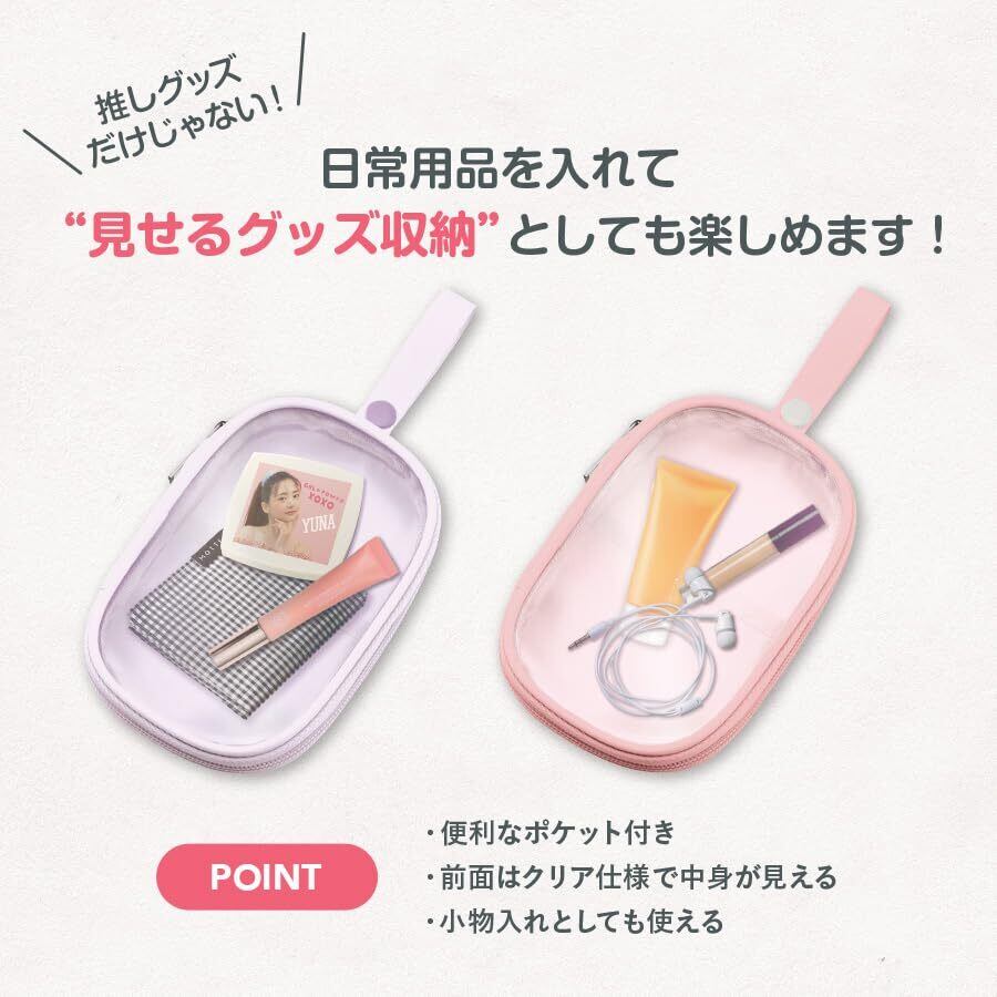 推し活におすすめ! 推し活の定番アイテム、アクリルスタンドを入れて持ち運べるポーチです。 前面はクリア仕様になっており、お気に入りのアクリルスタンドや缶バッチを入れれば、 中に入れたグッズを見せて楽しむことができます。 ポーチには推しグッズはもちろん、お好きなものを入れて見せる収納として使うのもおすすめです。 ポケット付きなので小物入れとしても便利に活用でき、 また本体と同色のストラップ付きなので、バッグなどに取り付けていつでも持ち歩くことができます。 豊富な8カラー展開です!