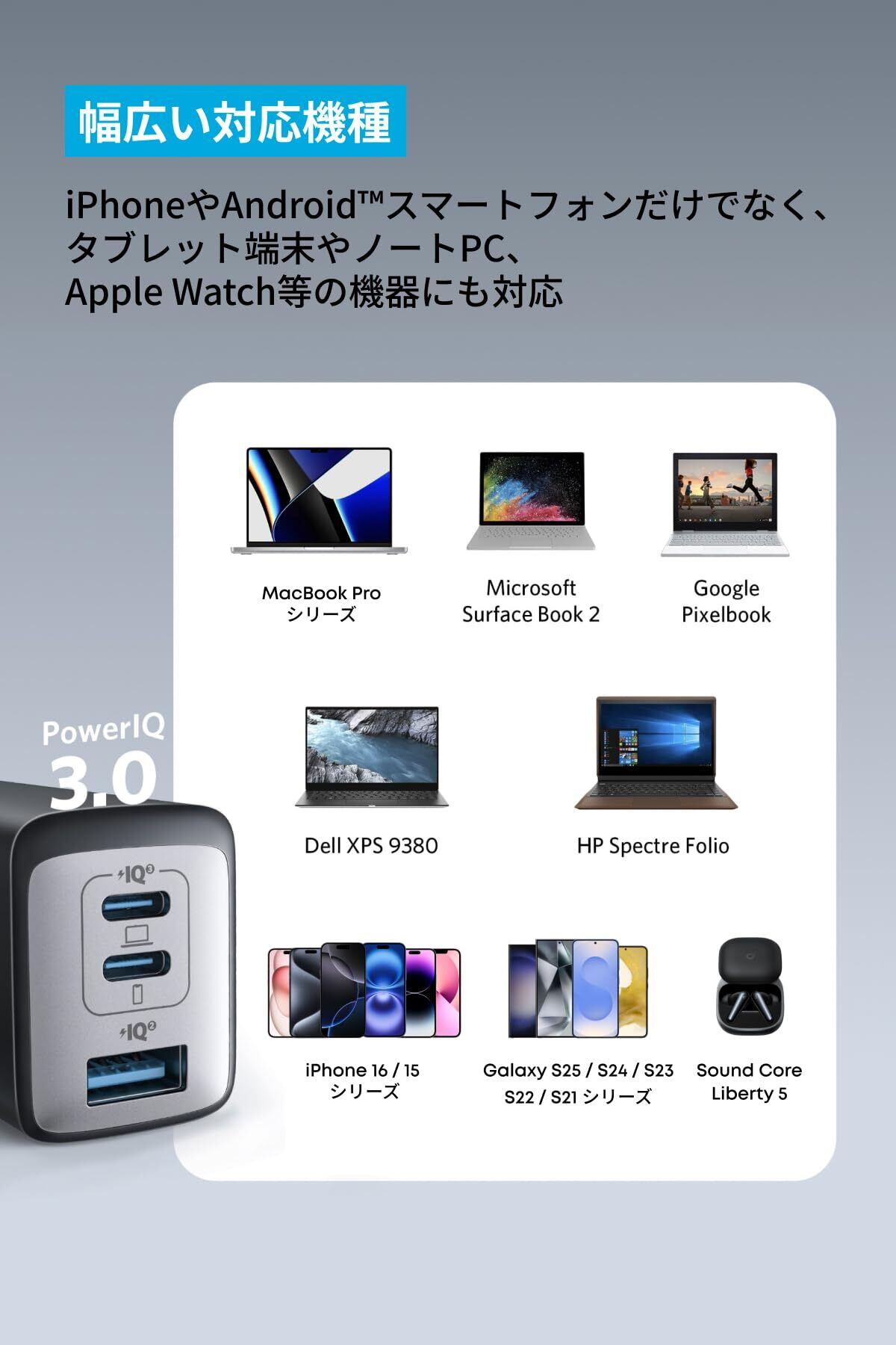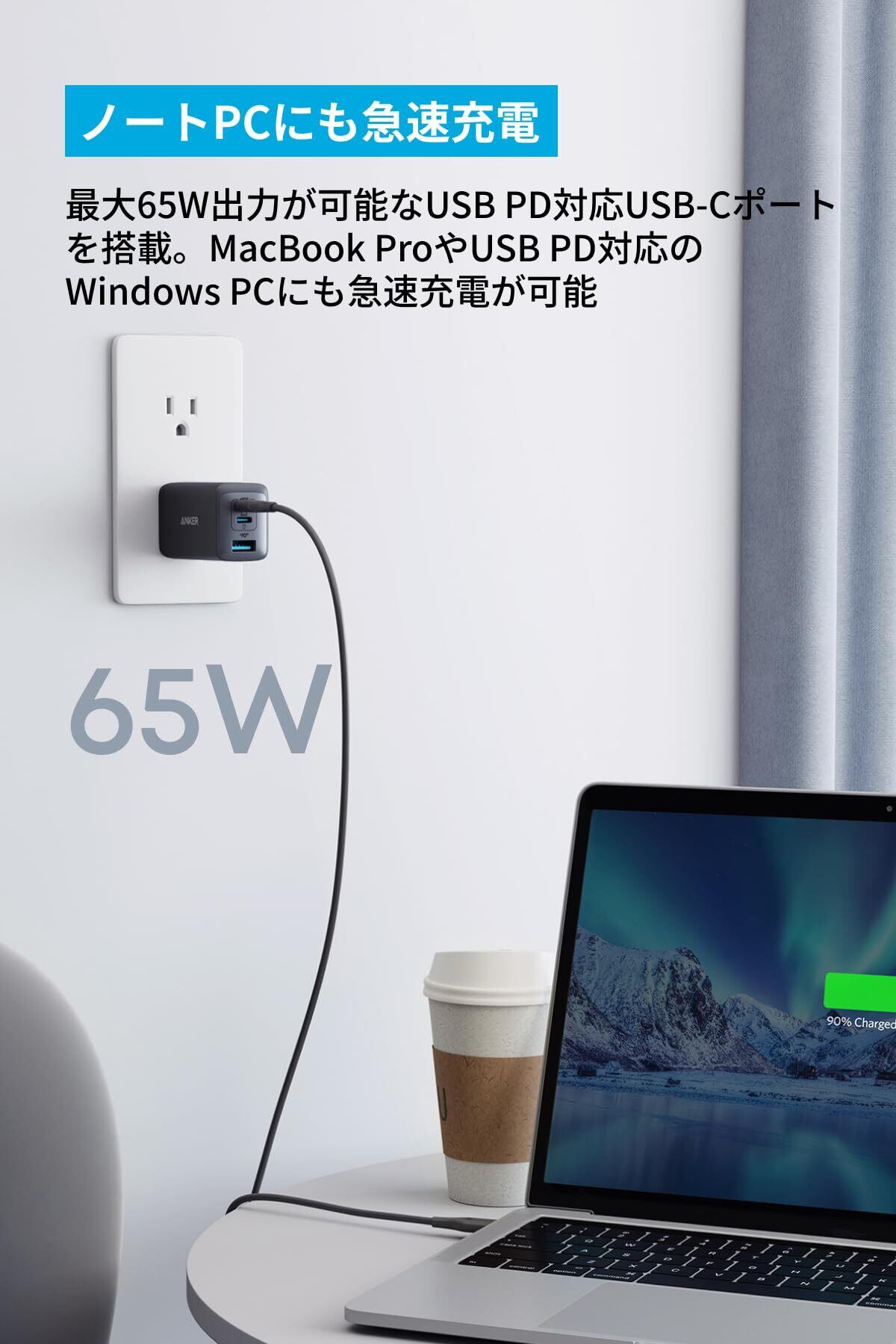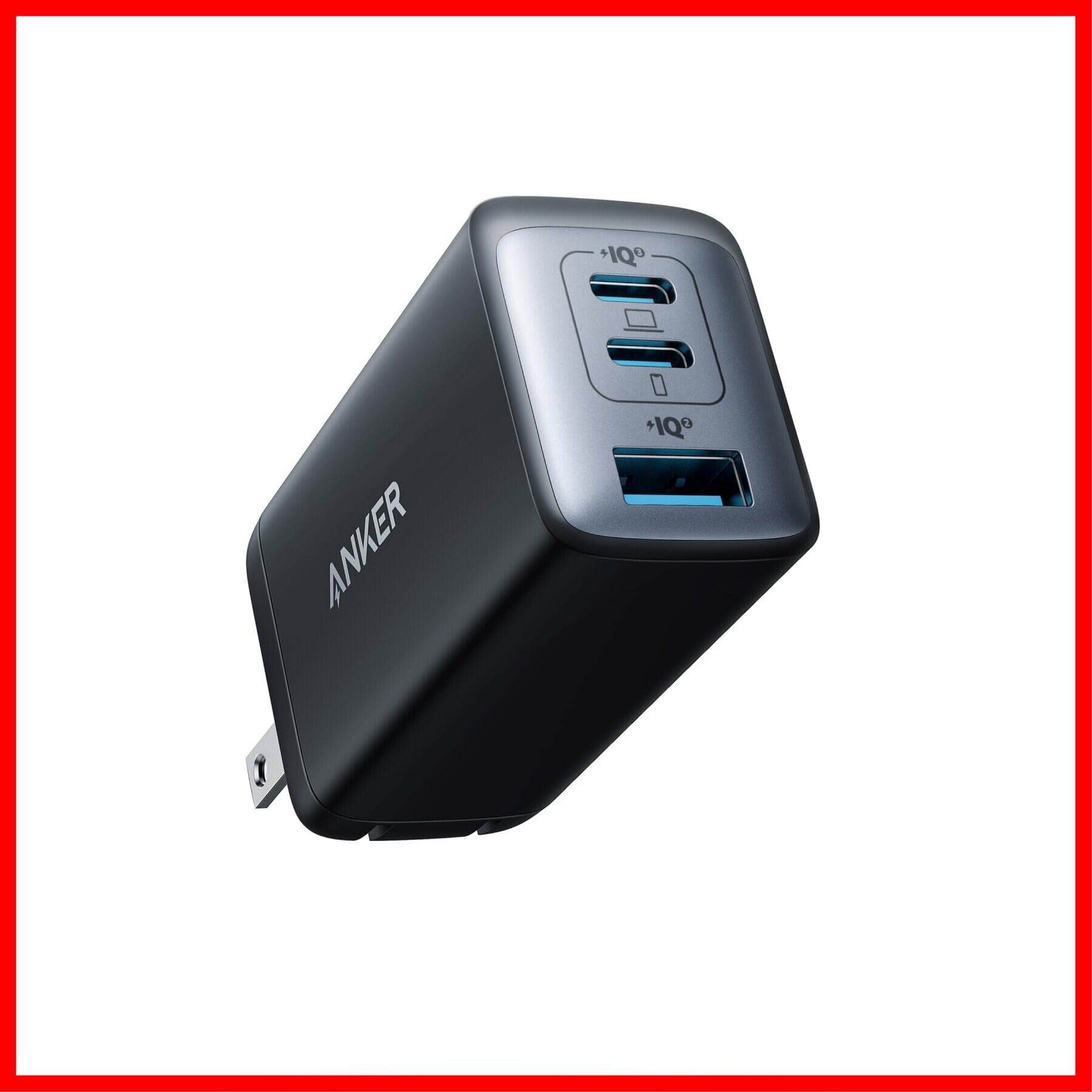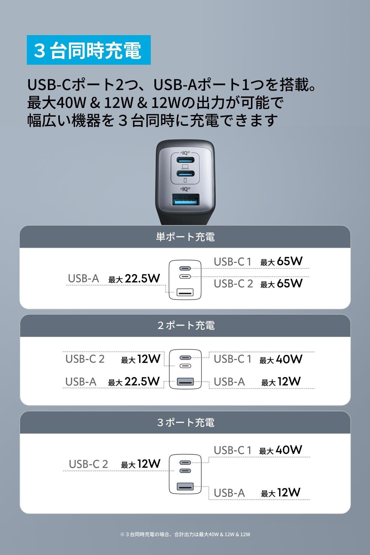 3台同時に充電可能:スマートフォン、タブレット、MacBook、USB PD対応のWindowsノートPCなど、多種多様なデバイスを一度に充電可能。PowerIQ 3.0 (Gen 2) を 搭載した2つのUSB-CポーとAnker独自技術PowerIQ搭載のUSB-Aポートを備えています。3ポート利用時の合計最大出力は65Wと高出力。機器毎に異なる充電器を持ち運ぶ必要はありません。※3ポート利用時の合計最大出力は64W
