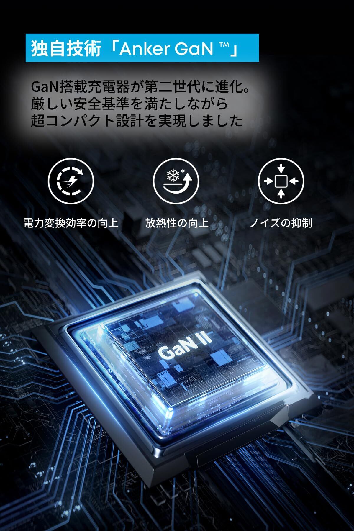 独自技術「Anker GaN II」 採用:GaN(窒化ガリウム)搭載USB充電器が第二世代に進化。電源ICと回路設計に革新を起こすことで、スイッチング周波数を高めて電子部品を省サイズ化するとともに、熱およびEMI(ノイズ)対策を施し厳しい安全基準を満たしながらさらなる小型軽量デザインを実現しました。