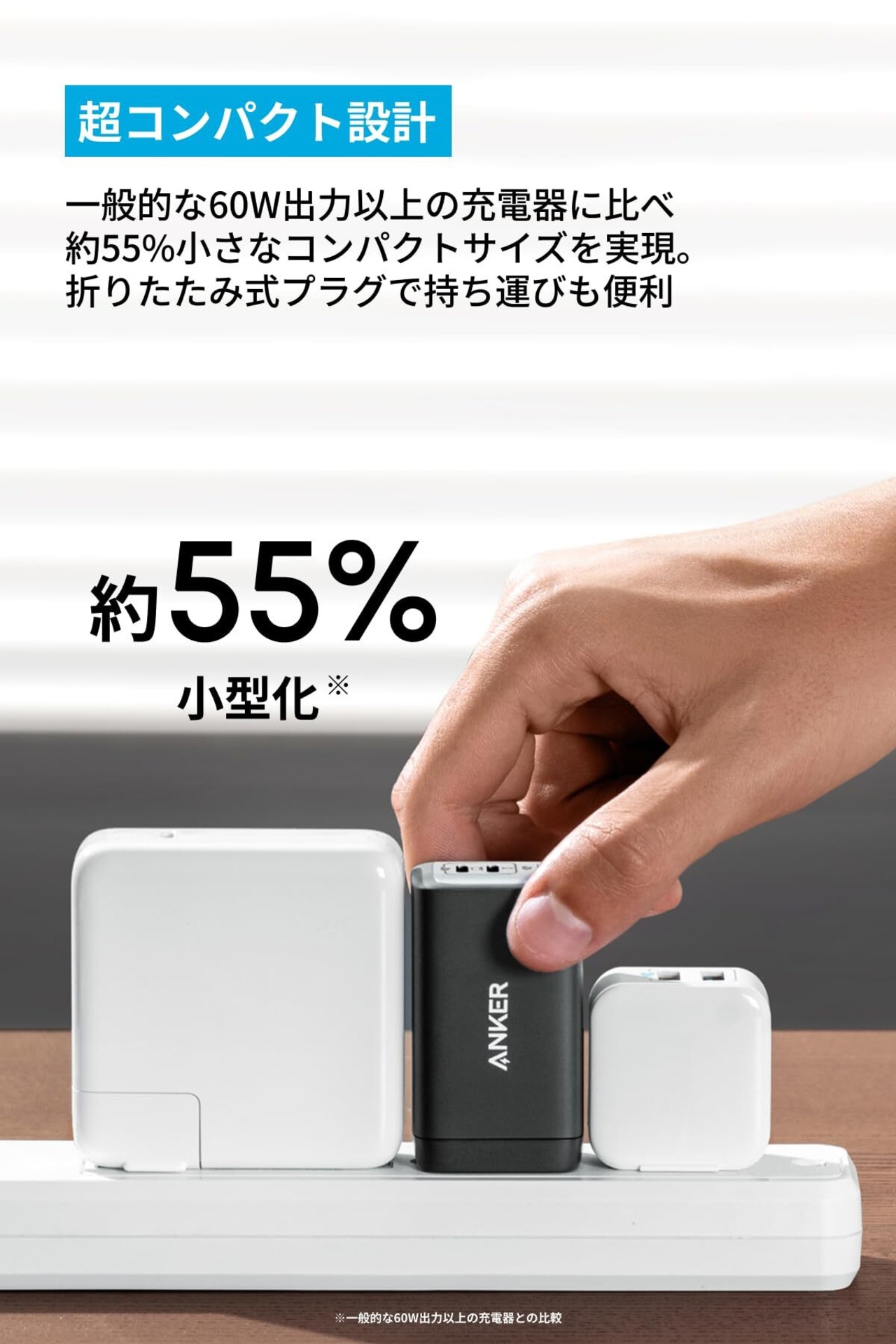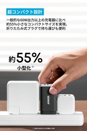 コンパクトで持ち運びやすい:一般的な60W出力以上の充電器と比較して約55%小さいコンパクトサイズ。折りたたみ式プラグを採用しているため、どこへでも気軽に持ち運ぶことができます。