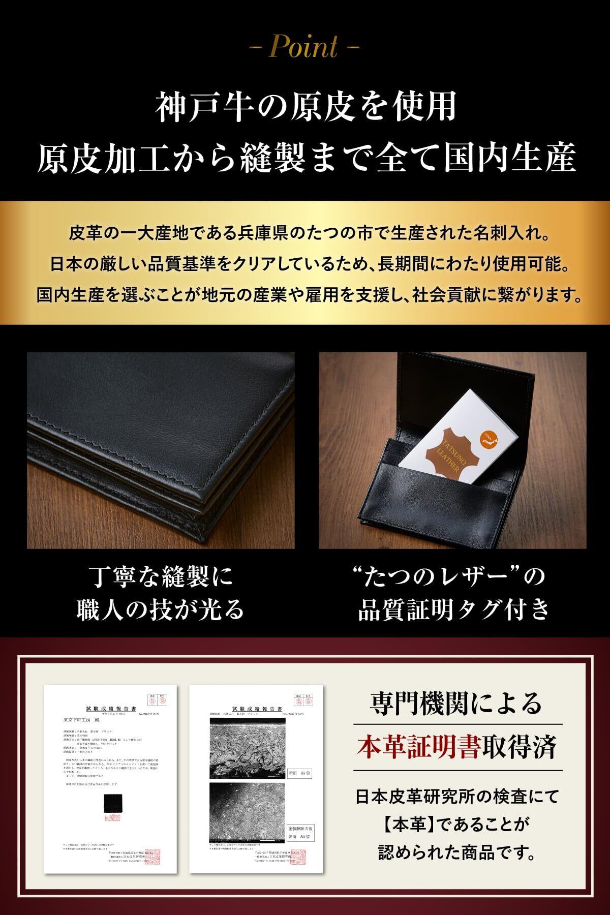 【神戸牛の原皮を使用/原皮加工から縫製まで全て国内生産】皮革の一大産地である兵庫県のたつの市で生産された名刺入れ。日本の厳しい品質基準をクリアしているため、ハイクオリティーで長期間にわたり使用可能。国内生産を選ぶことが地元の産業や雇用を支援し、社会貢献に繋がります。【専門機関による本革証明書取得済】日本皮革研究所の検査にて“本革”であることが認められた商品です。