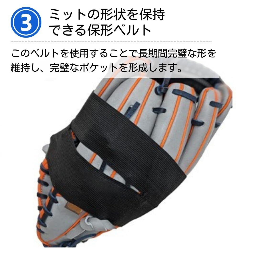 【理想のポケットを維持するミッ保形ベルト】このベルトを使用することでミットの形状が崩れず、ボールを取りやすい形を保つことができます。