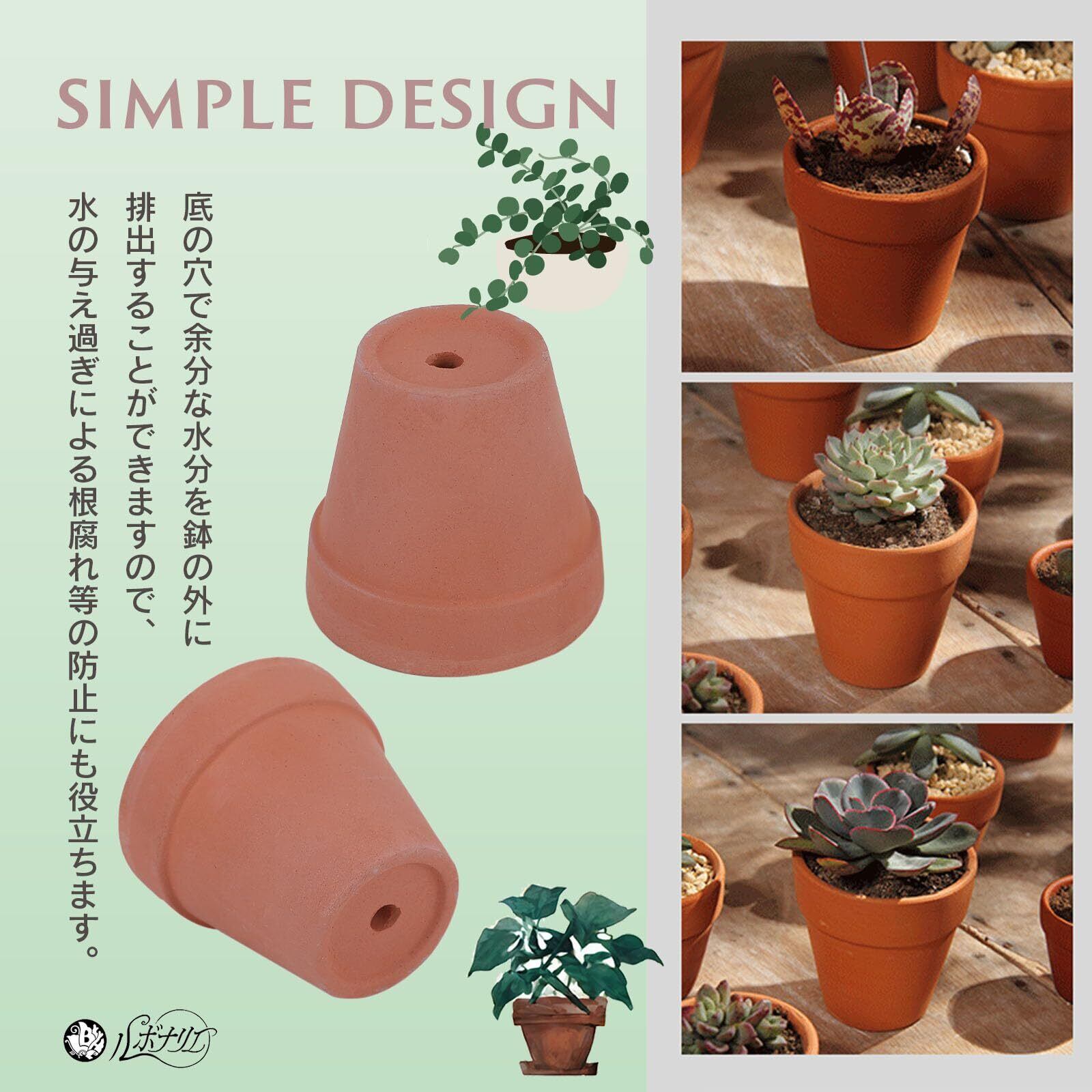 素焼きのテラコッタ素材ですので、鉢内の湿度と通気性を調節し、植物の生育をサポートします。底の穴で余分な水分を鉢の外に排出することができますので、水の与え過ぎによる根腐れ等の防止にも役立ちます。