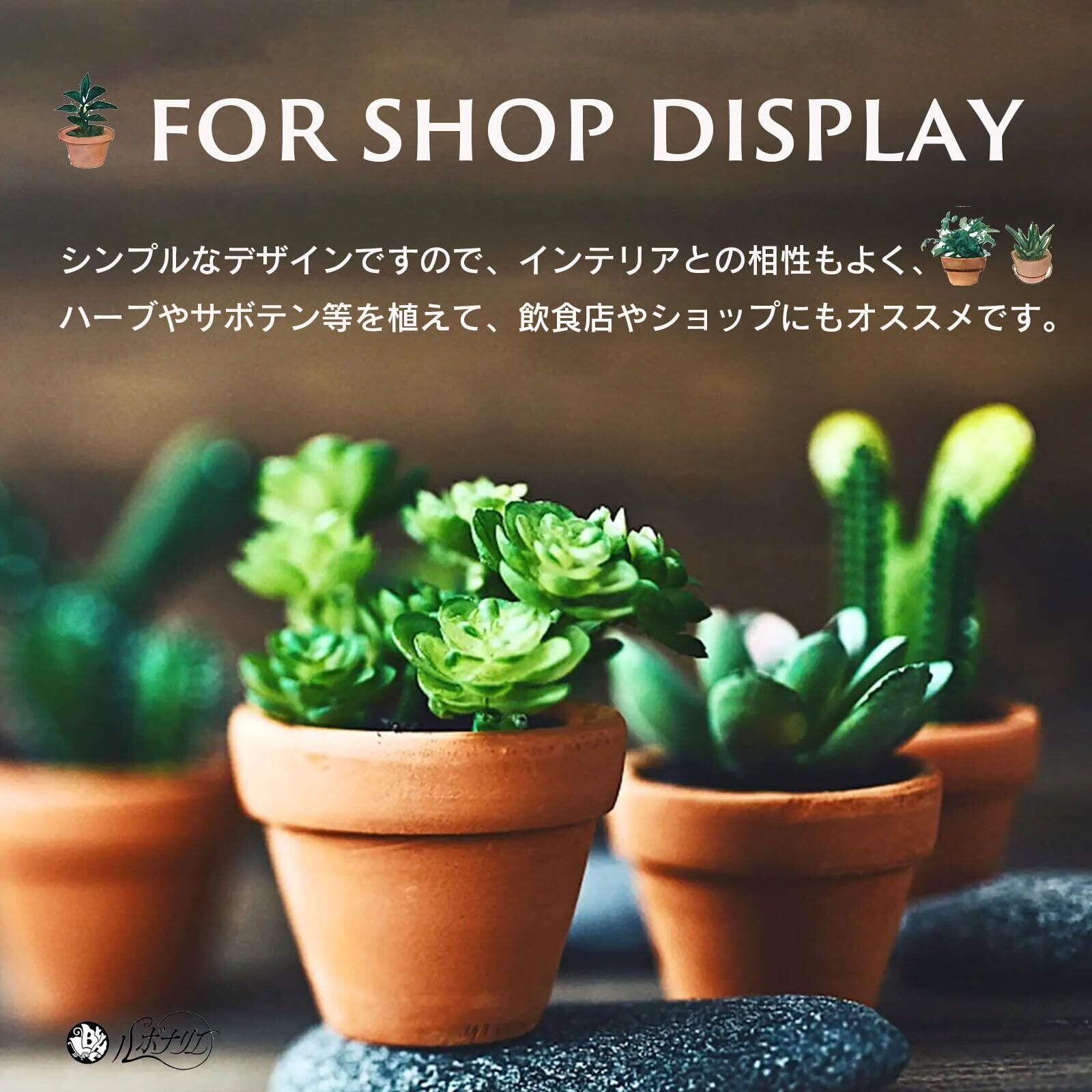 シンプルなデザインですので、インテリアとの相性もよく、ハーブやサボテン等を植えて、飲食店やショップのディスプレイにもオススメです。開業時の贈り物としても大変喜ばれます。