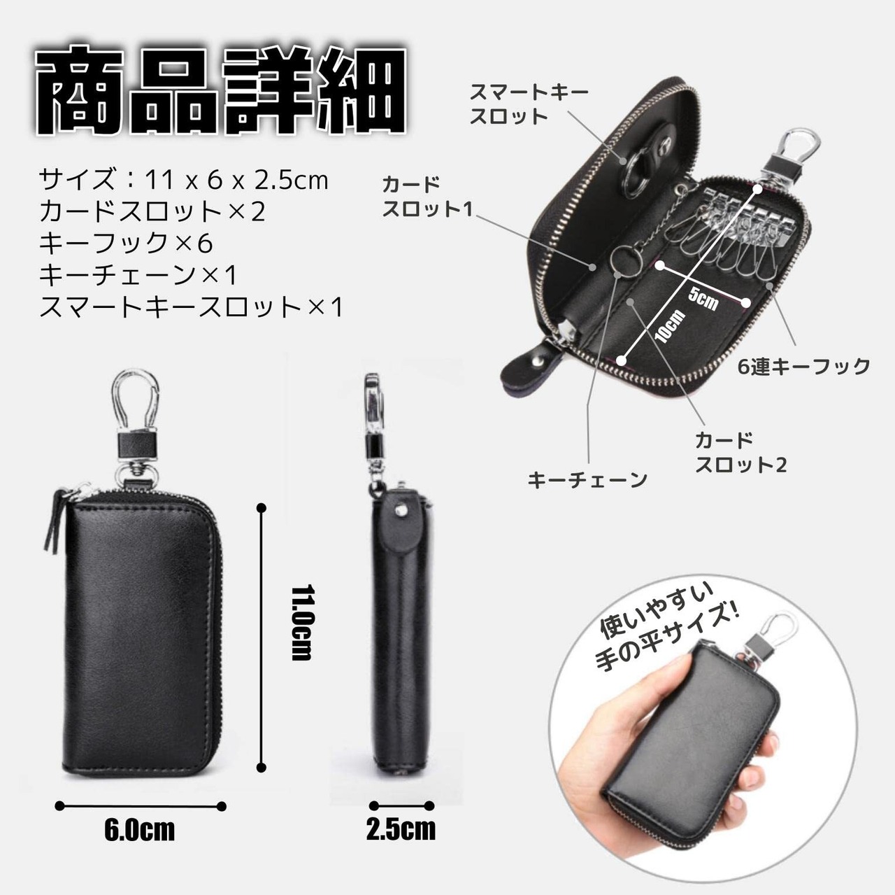 【カラー】PUレザーの質感を生かした13カラーのラインナップです。 Black (ブラック) / Navy (ネイビー) / Red (レッド) / WineRed (ワインレッド) / Brown (ブラウン) / DarkBrown (ダークブラウン) / Pink (ピンク) / DeepPink (ディープピンク) / CreamYellow (クリームイエロー) / MintGreen (ミントグリーン) / TurquoiseBlue (ターコイズブルー) / RoseQuartz(ロースクォーツ) / RosieBrown(ロージーブラウン)【商品詳細】サイズ:11 x 6 x 2.5cm/カードスロット✕2/キーフック✕6/キーチェーン✕1/スマートキースロット✕1