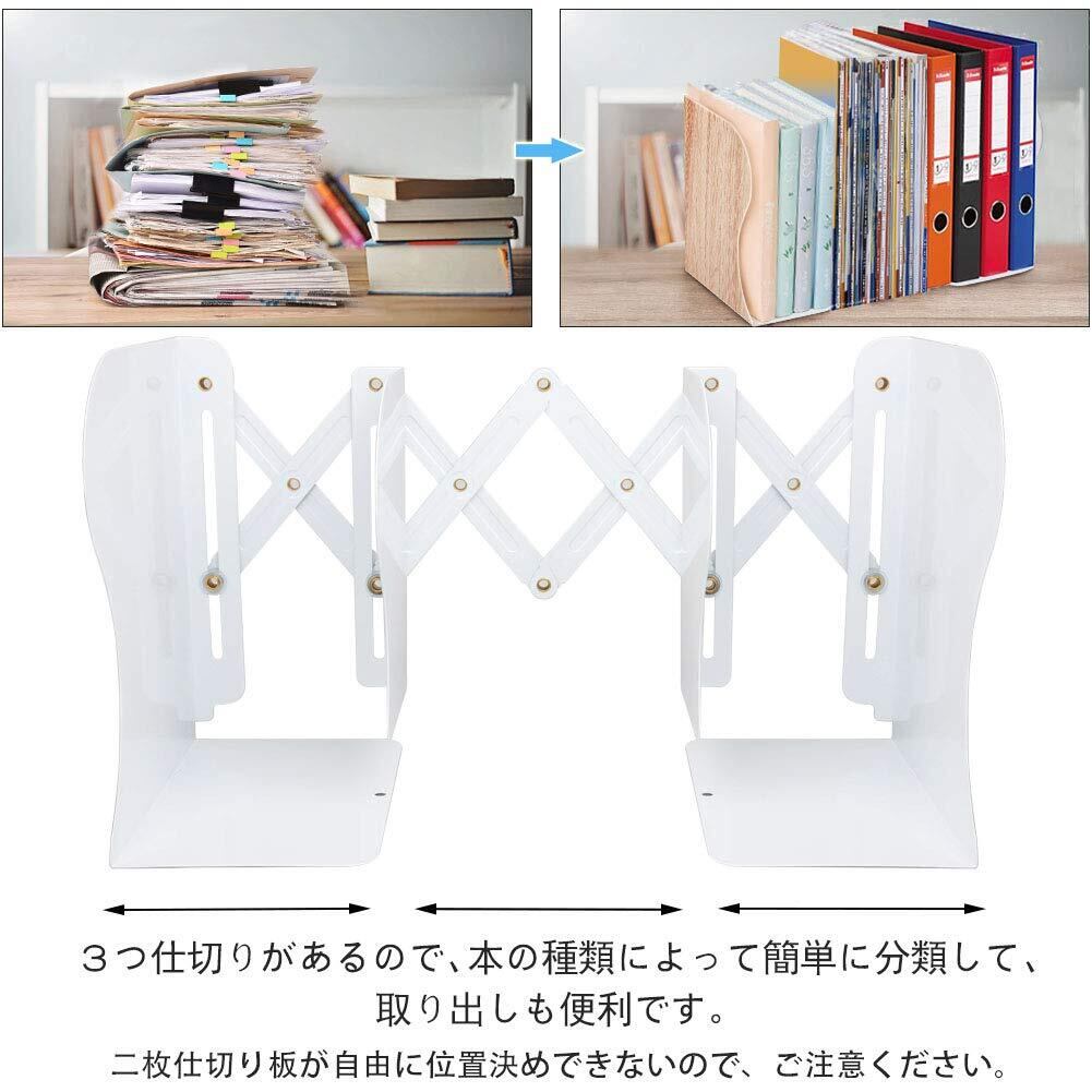 ブックエンド 本立て 伸縮自在 卓上収納 倒れない ブックスタンド 金属製 仕切りスタンド デスク整理 (ホワイト)