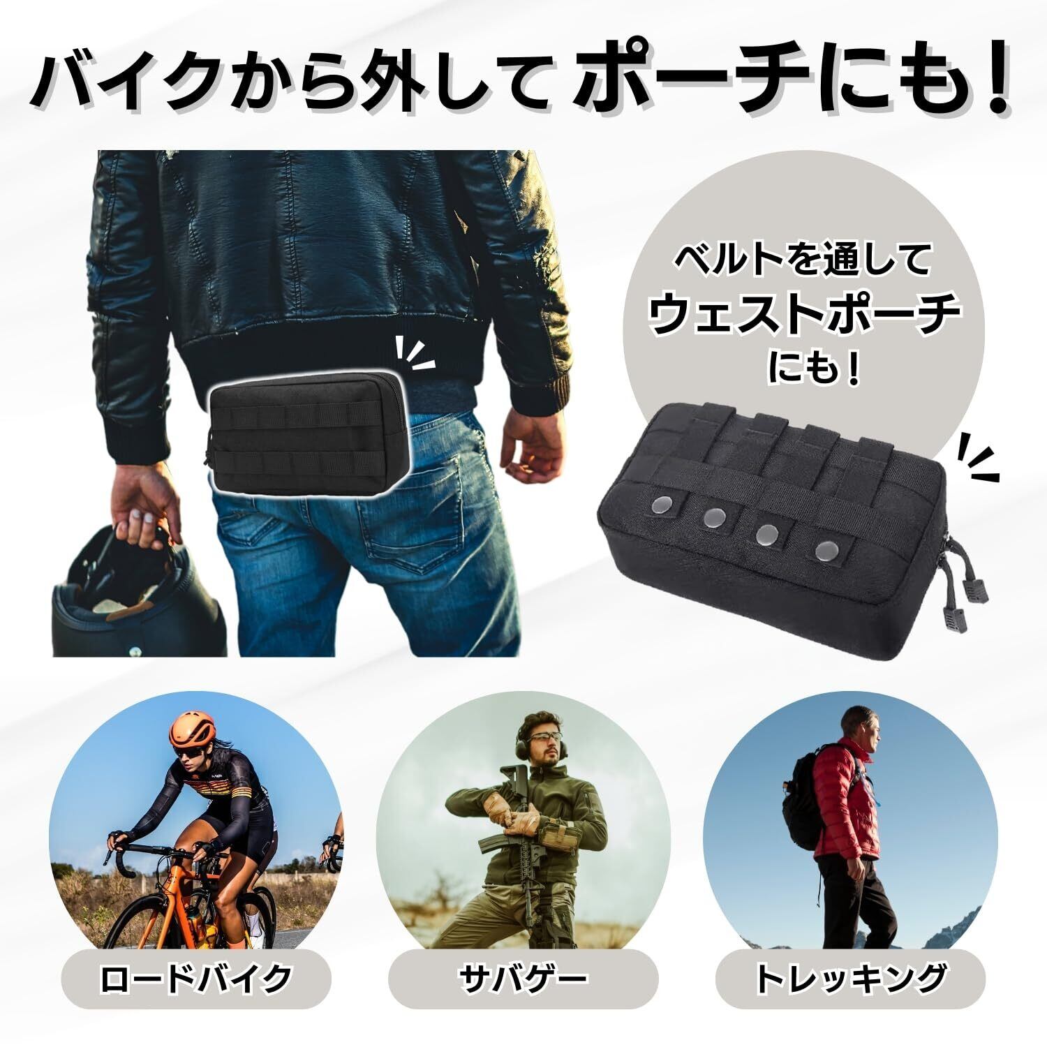 ベルト装着とボタン装着の2way機能付き!軽量で頑丈なデザインは、ツールやスマホを快適に収納できます。工具バッグやツールポーチとしての役割を果たします。ツーリングやサイクリングに欠かせないアイテムであり、ベルトを通してウエストポーチとしても使用可能なバイクサイドバッグです。 バイクに取り付けて、あなたの冒険がさらに広がります。自転車にも取り付け可能です。ツーリングバッグとして空気入れや他の必需品もすっきり収納できるので、ロードバイクライフがより充実します。フロントバッグとしても使用可能で、あなたのバイクライフをサポートします。