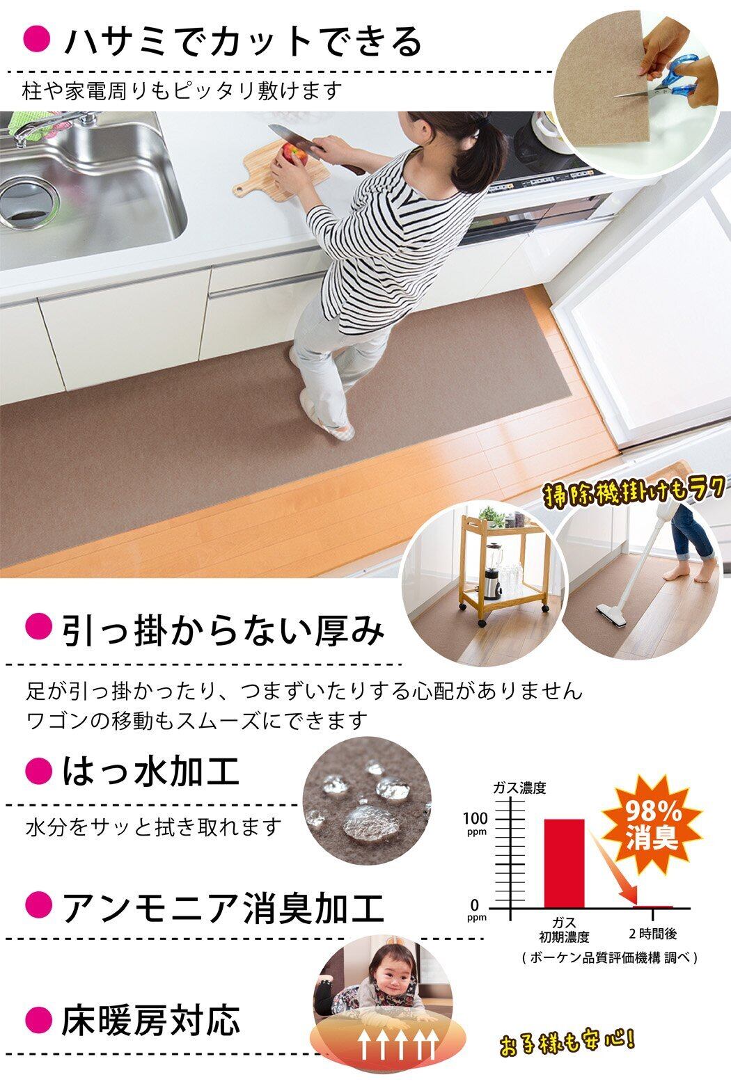 【特徴】撥水加工(防水仕様ではない)、洗濯機可(ネット使用・乾燥機不可)、カット可能、床暖房対応