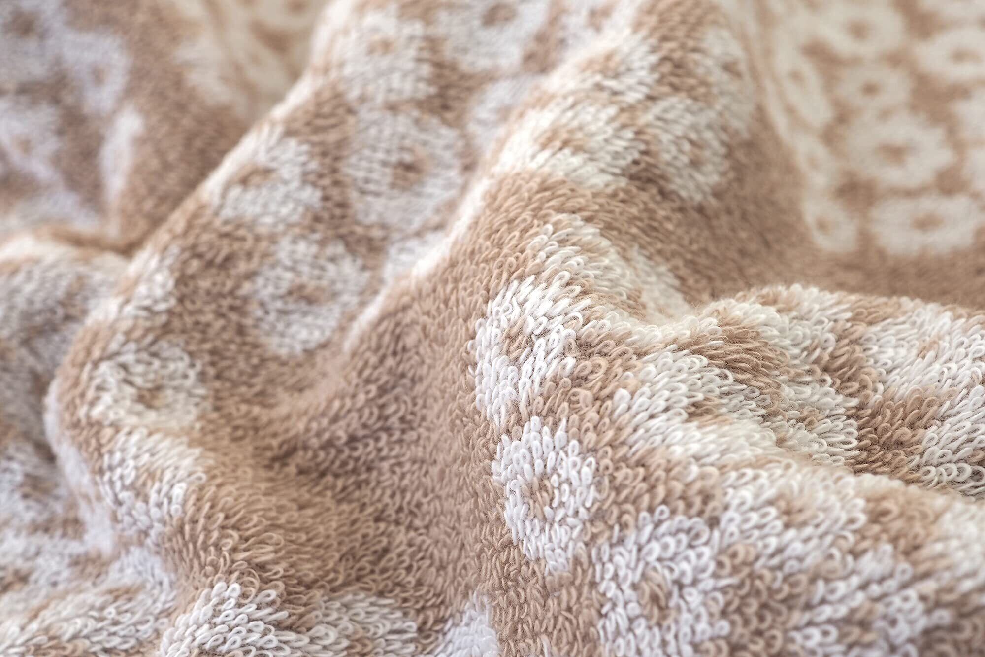 「花束」をモチーフにつくられたデザイン。少しくすんだ色合いが優しいイメージとぴったりです。普通の糸より、撚りが甘いあま撚り糸を使った、ふんわりと肌触りのやさしいタオルです。