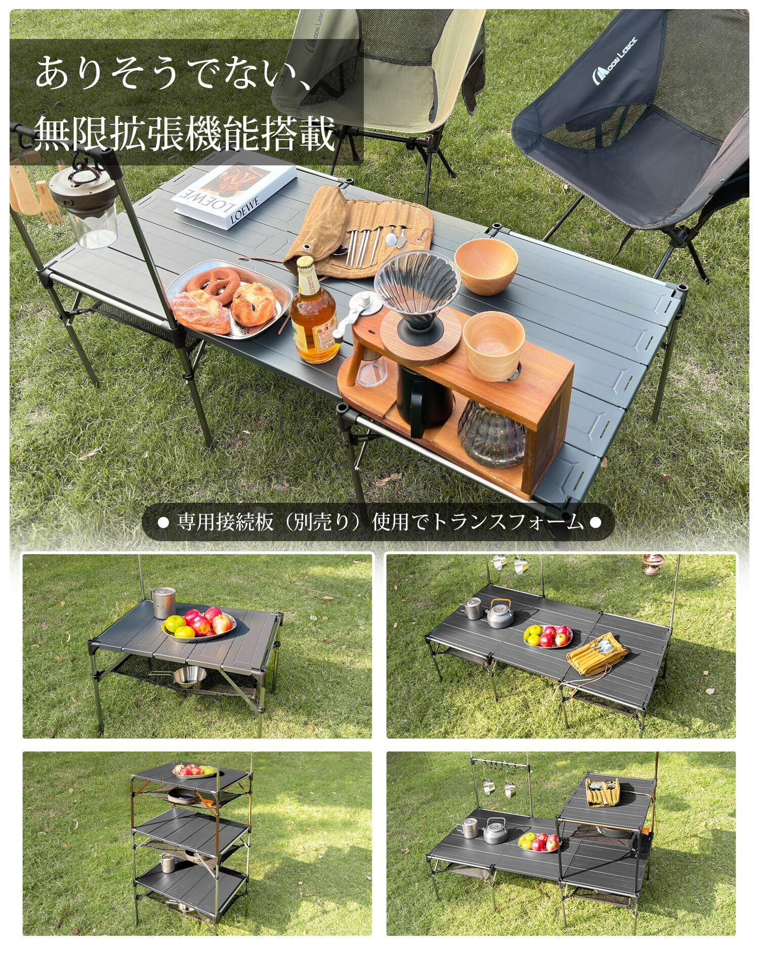 【拡張&スタッキング対応|自由にカスタマイズ】別売のジョイント板を使えば、テーブル同士を横に連結可能!さらに縦に積み重ねてラック化もOK。ソロからファミリーキャンプまで柔軟に対応。