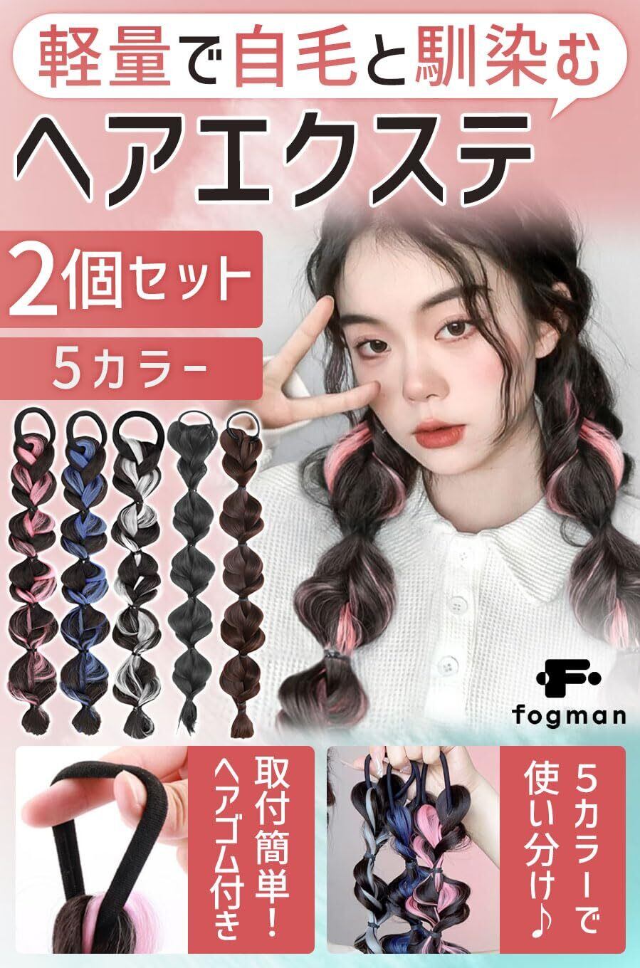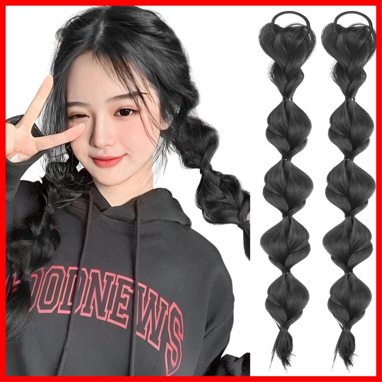 fogman エクステ ヘアエクステ 三つ編み カラー ウィッグ ツイン かわいい 髪 2個セット (ブラック)