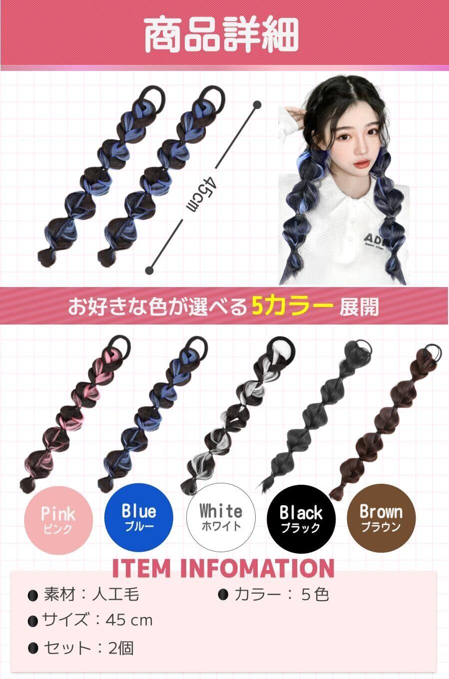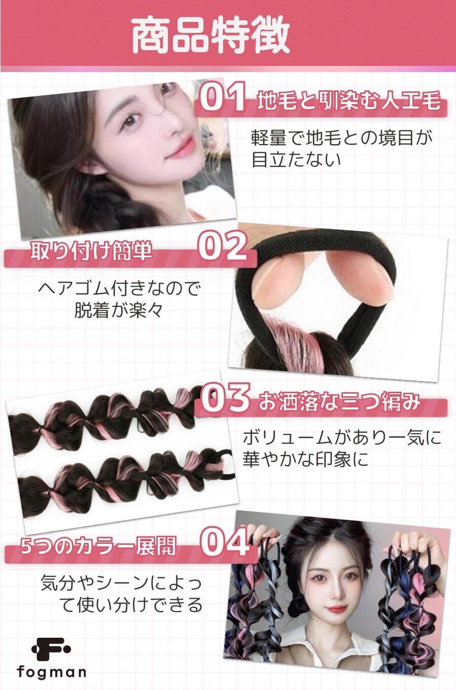 【商品特徴】①地毛と馴染む人工毛:軽量で地毛との境目が目立たない/②取り付け簡単:ヘアゴム付きなので脱着が楽々/③お洒落な三つ編み:ボリュームがあり一気に華やかな印象に/④5つのカラー展開:気分やシーンによって使い分けできる