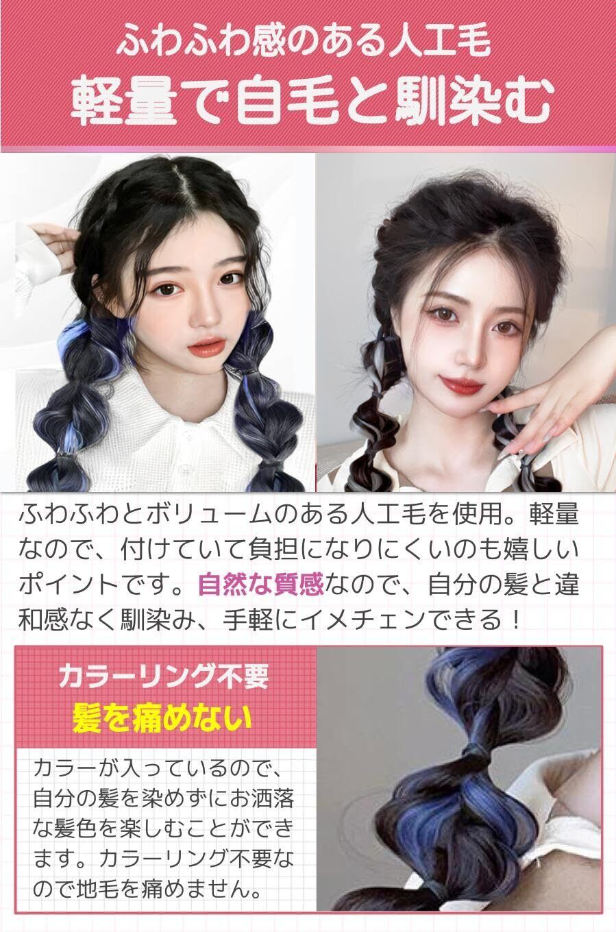 【髪を痛めない】カラーが入っているので、自分の髪を染めずにお洒落な髪色を楽しむことができます。カラーリング不要なので地毛を痛めません。