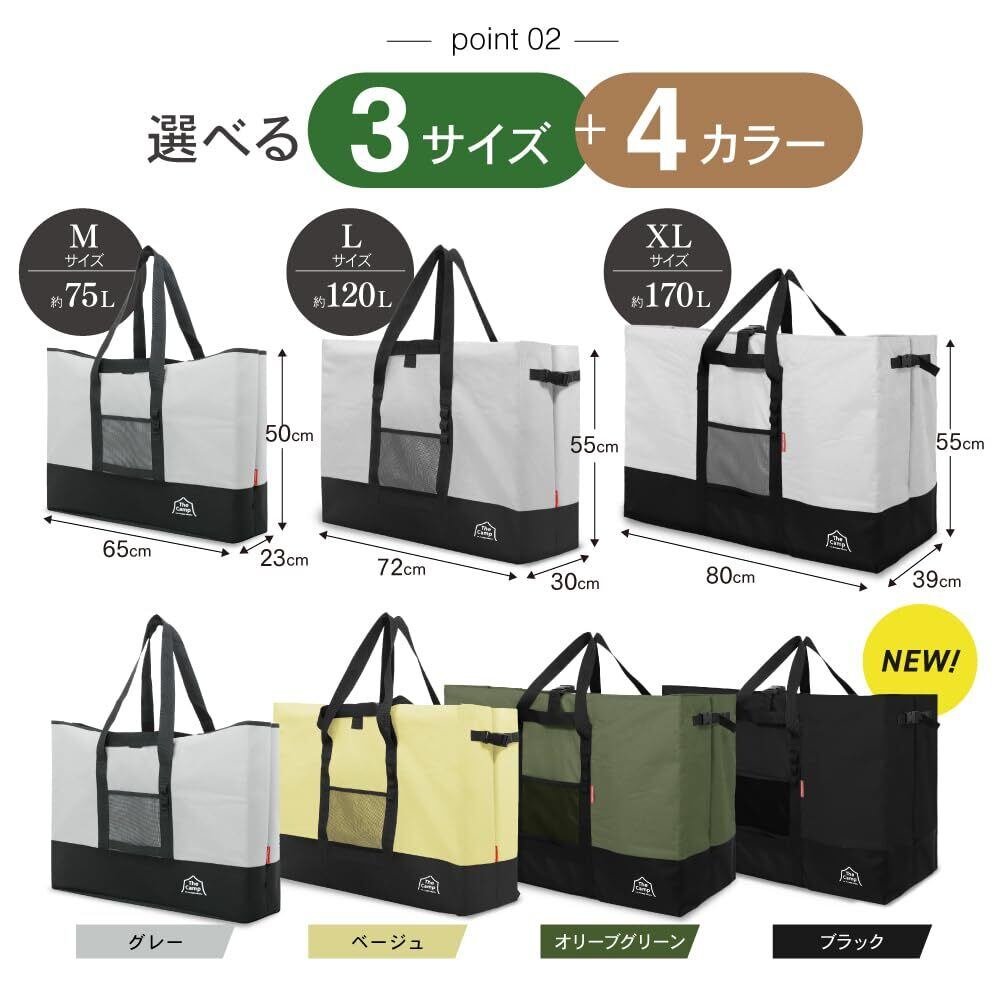【ギアもガンガン詰め込める!キャンプで活躍の大型収納バッグ】頑丈で大容量なだけでなく、ギアの運搬をよりスムーズにするディティールを備えた高い機能性トートバッグです。テントや寝袋などの大きなギアも入るので、お気に入りのギアをたっぷりと持って行くことができ、あなたのアウトドアライフをより充実させます。収納袋付きなので、使用後はコンパクトに折りたたんで収納することができます。