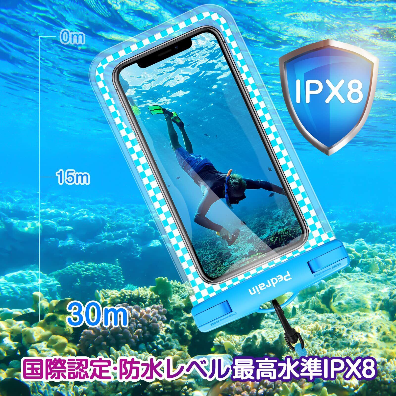 【IPX8超強防水&保護力アップ】 SGS機構認証の最高レベル防水国際保護等級IPX8を達成した防水ケースが新登場!更に新デザインの頑丈なボタン保護により、最大防水深さは30メートルで30分間の防水性能を実現し、水没しても内部への水の浸入を完全に防ぐことができます。水だけでなく、雪・砂・汚れもなどからスマホを保護します。(IPX8認証番号:SZIN1907010144PC)