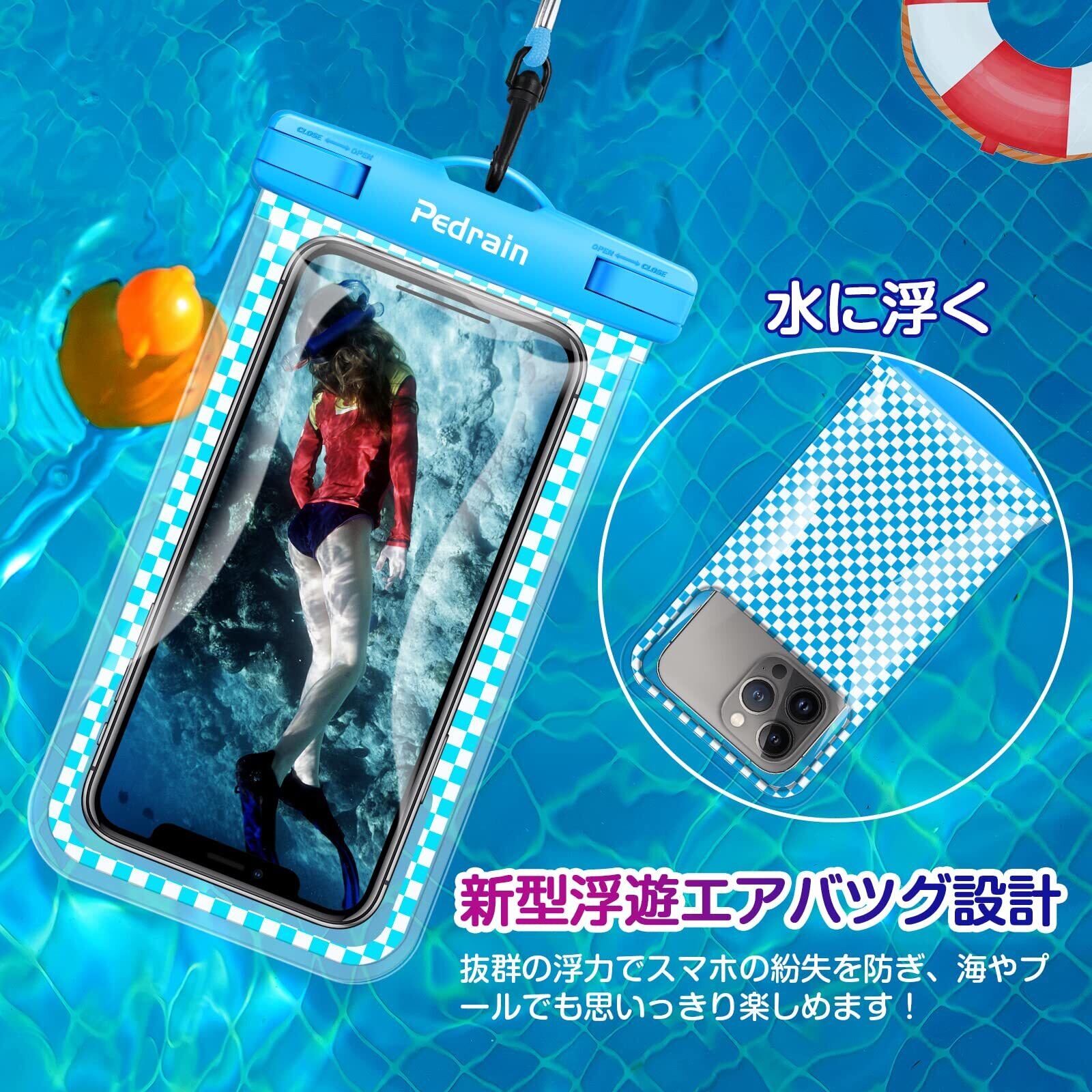 【新型エアバツグ設計・安心対策】 スマホ 防水ケースは、背面に水に浮く特殊な「エアバッグ構造」を採用しています。 背面の浮き輪で海やプールに落ちても自然に浮き上がり、沈まなくてスマホの紛失を防ぎます。また、通常の防水カバーよりも耐衝撃性に優れています。エアバッグ構造により、落下などの衝撃を分散させ、砂やホコリなどが直接触れることがありません。過酷な環境下でも高い耐衝撃性を発揮し、スマホを全方位からしっかりと守ります。