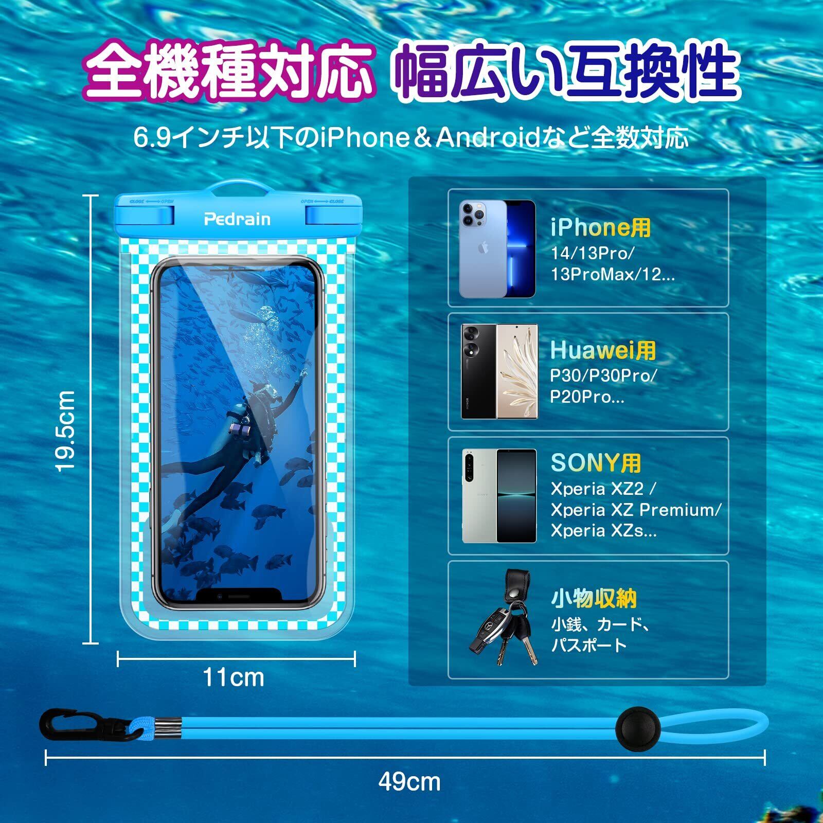 【幅広く・6.9インチ以内に全数対応】 お風呂 スマホ 防水ケースは市販のiPhone14/14Pro、iPhone13/13Pro/13mini、iPhone 12/12 Pro/12mini、iPhoneSE 、iPhone11/11Pro、iPhone XsMax/XR、Galaxy S22/Galaxy S21、Huawei P40/40Pro、Huawei P30、Xperia、Aquos、ZenFone、Androidなど6.9インチ以下の全機種携帯に適用。 ポーチは大容量で、スマホ以外に、パスポート、鍵、カード、現金なども収納でき、貴重品管理にも利用できます。(携帯電話を防水ケースに入れるときには、携帯電話の保護ケースを取り外すことをお勧めします)