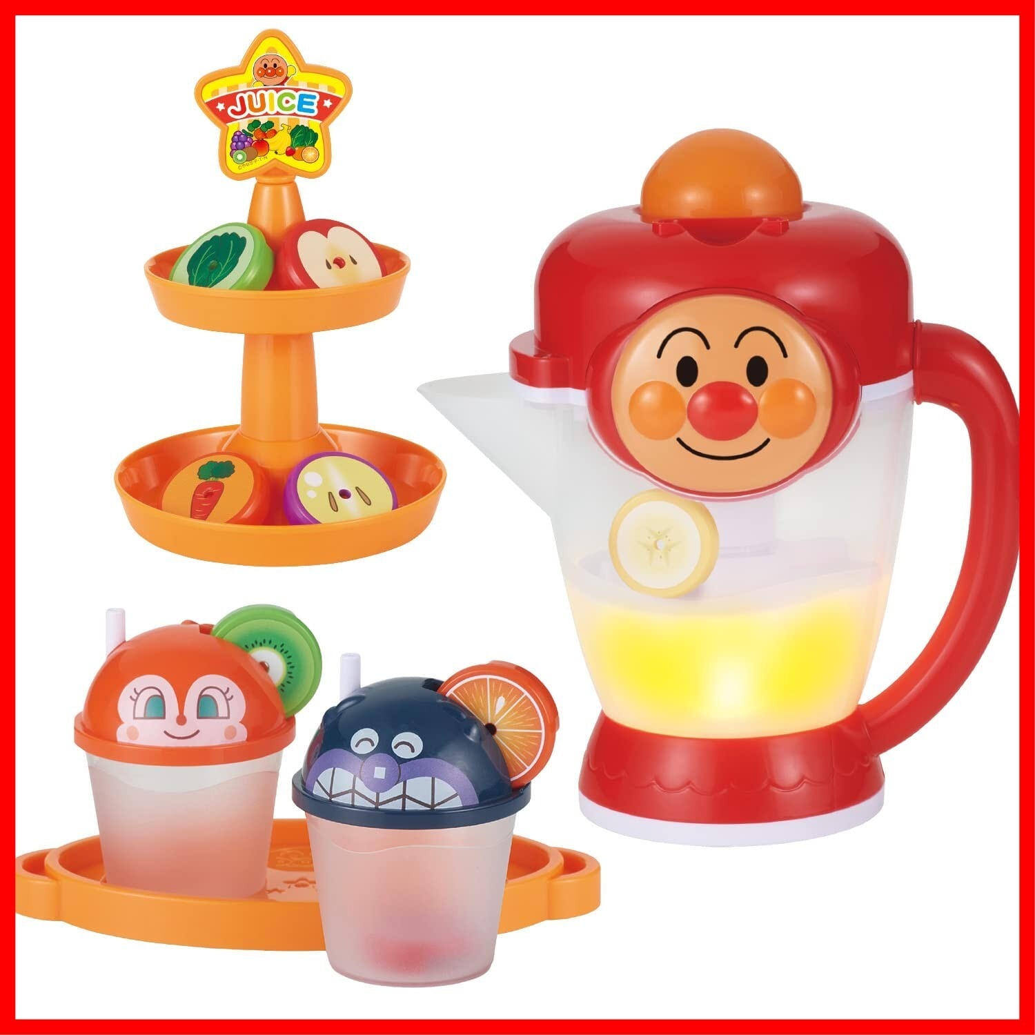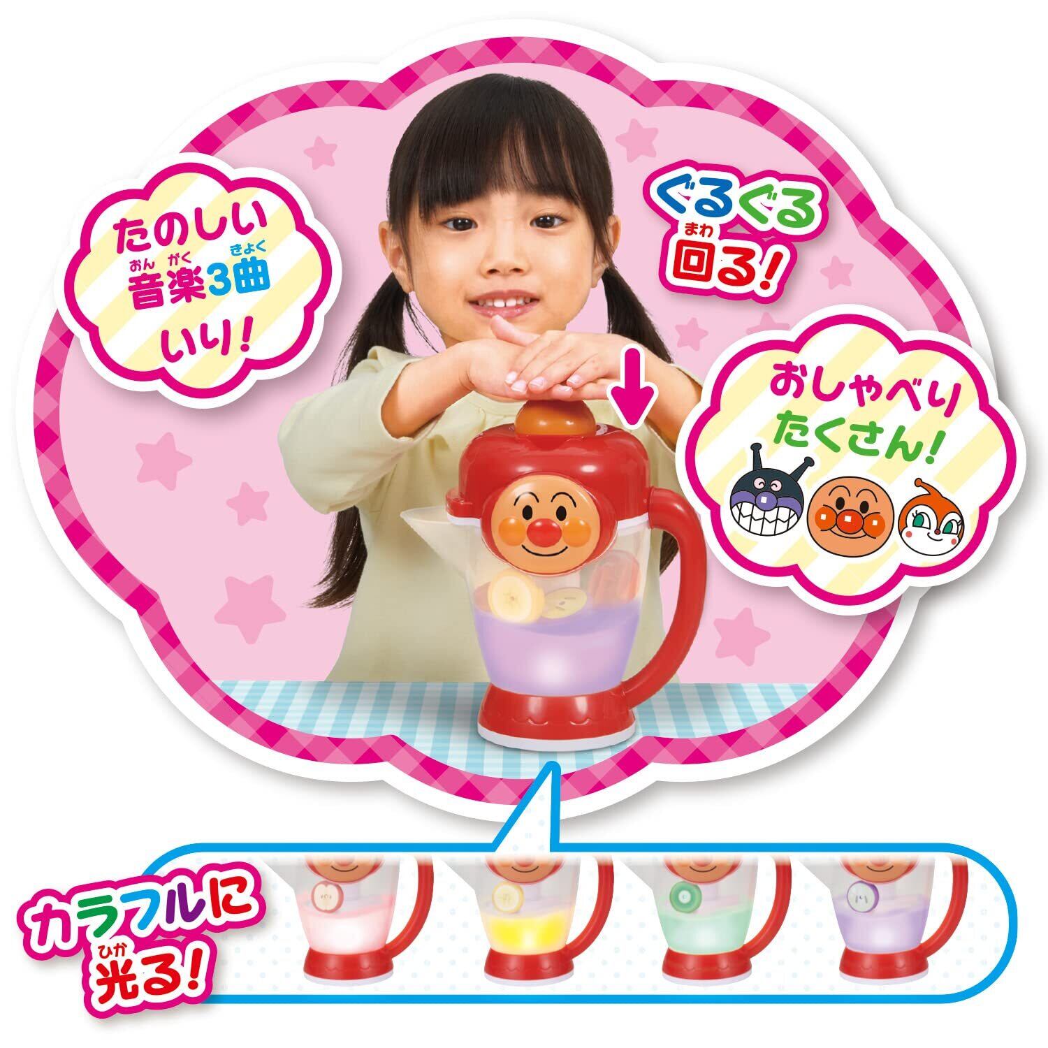 フルーツやおやさいをいれるとアンパンマンがなまえを読み上げ、本体が光ります!ボタンを押すと楽しい音楽とともに本体が回転し、ジューズづくりあそびが楽しめます。