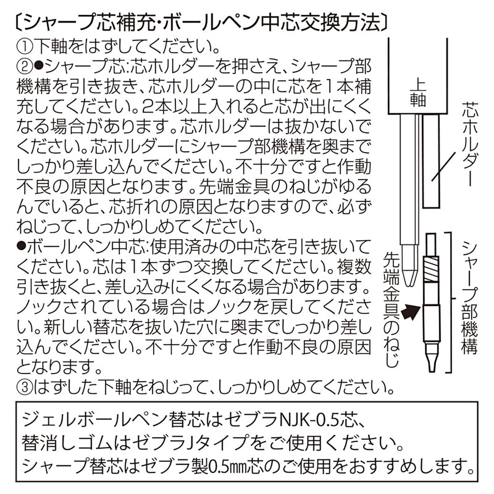 ボールペンインク色:黒、青、赤、緑。ボール径:0.5mm。シャープペンシル:0.5mm。