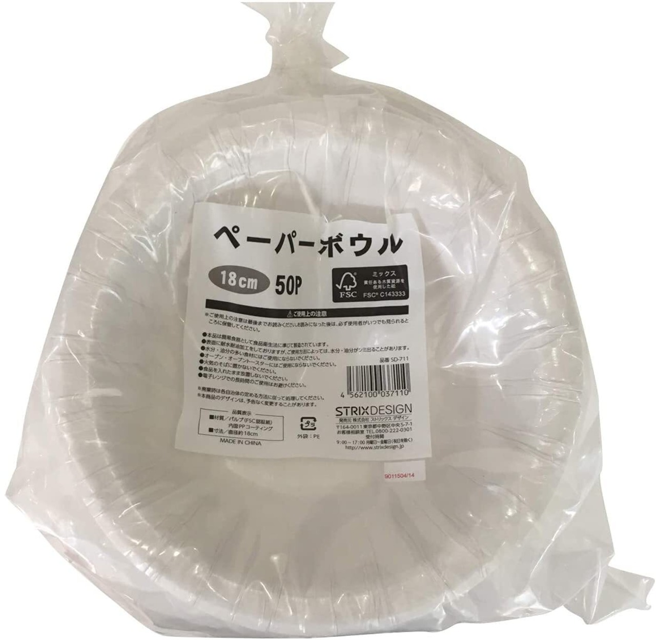 ストリックスデザイン 使い捨て 紙皿 ボウル 深皿 50枚 18cm 白 耐水・耐油加工で染みにくい レンジ対応 業務用 SD-711