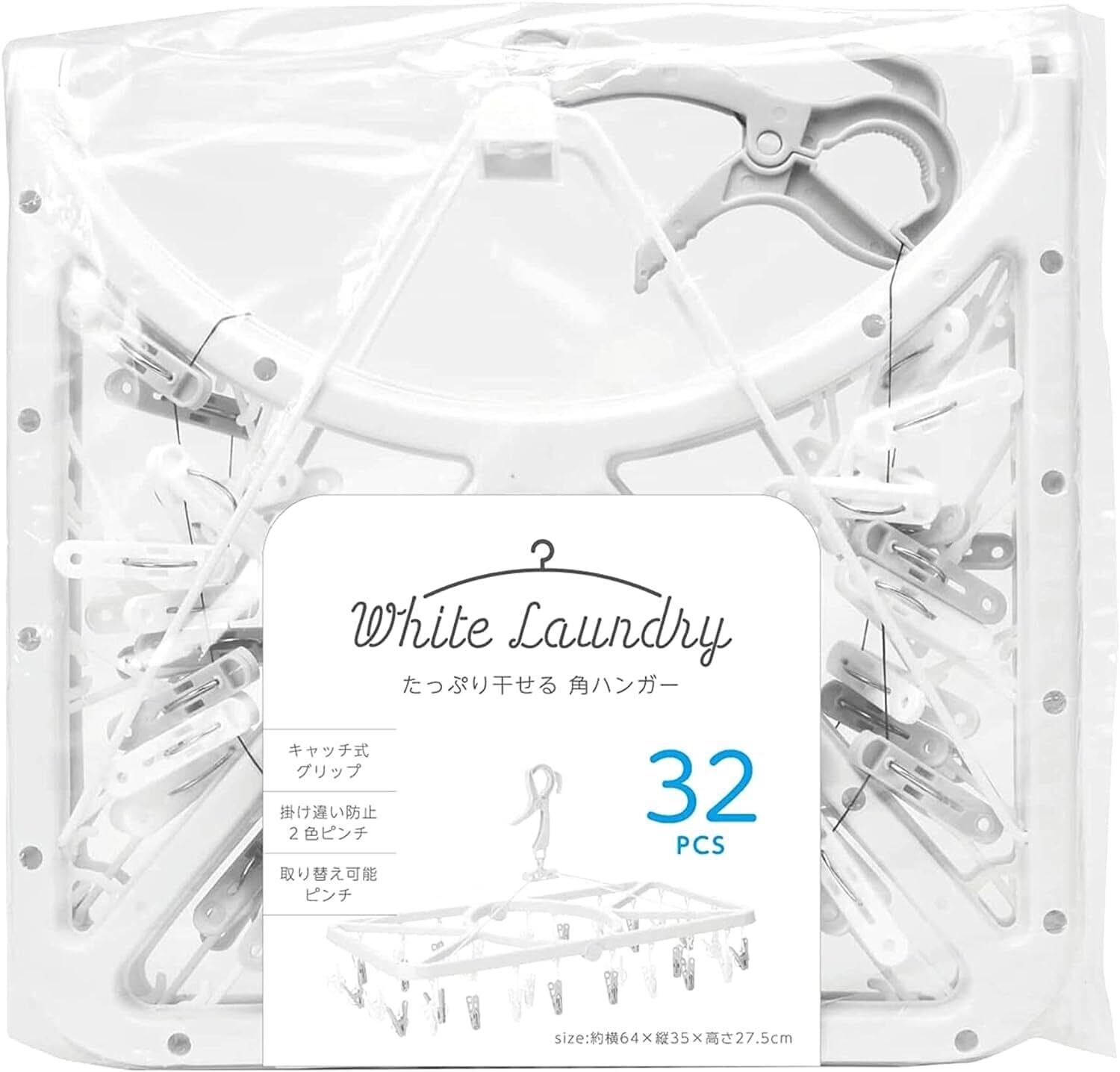 ● 特徴:32ピンチ、キャッチ式グリップ、シンプルなデザイン、大容量、ホワイト&グレー