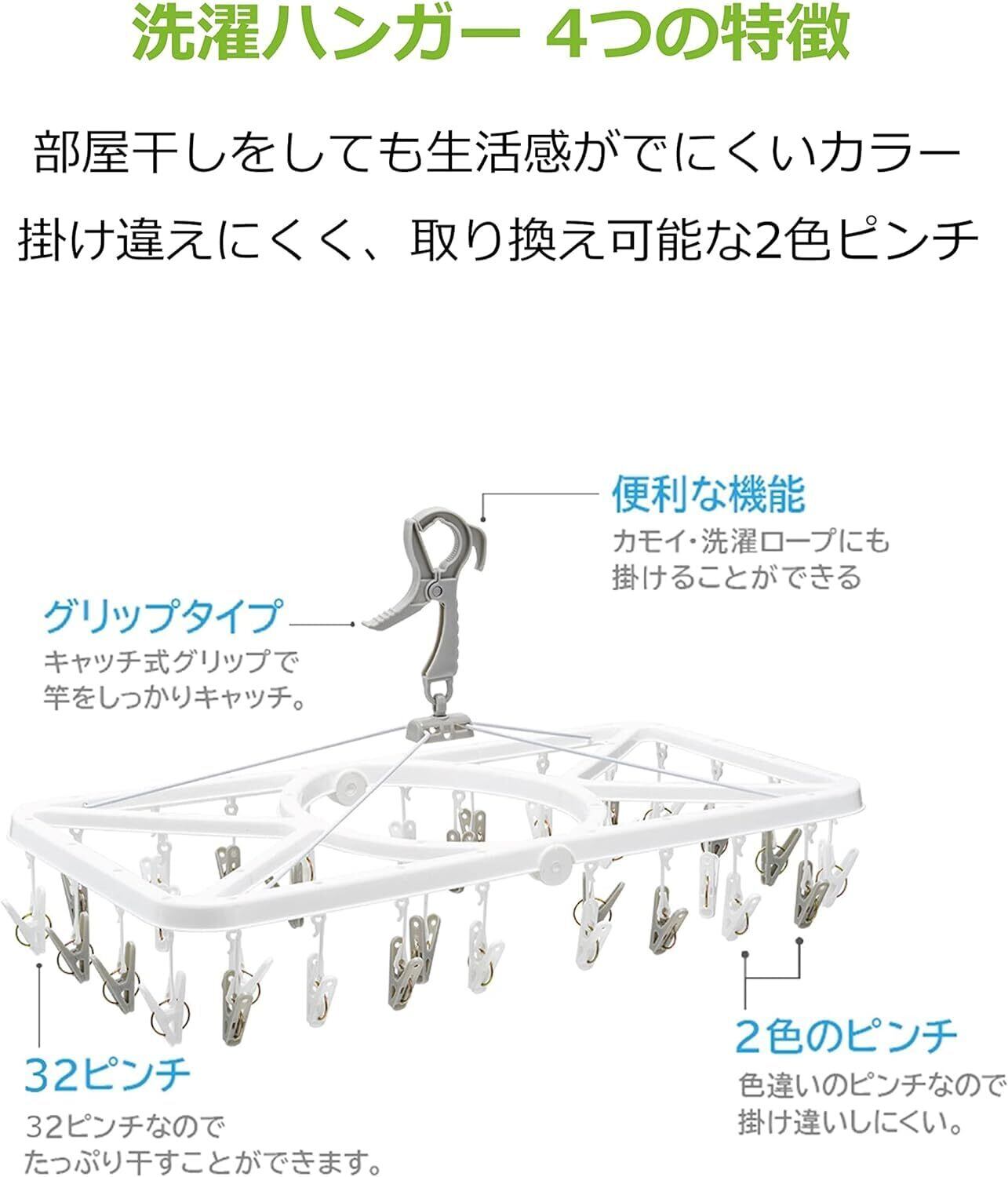 【たっぷりのピンチで安心干し!】 : 32ピンチのサイズは、Tシャツから靴下まで、様々な洗濯物をしっかりとホールドします。安心して干せるため、忙しい毎日の中でも大活躍することでしょう。これ一つで、洗濯物の整理整頓が楽々になります。
