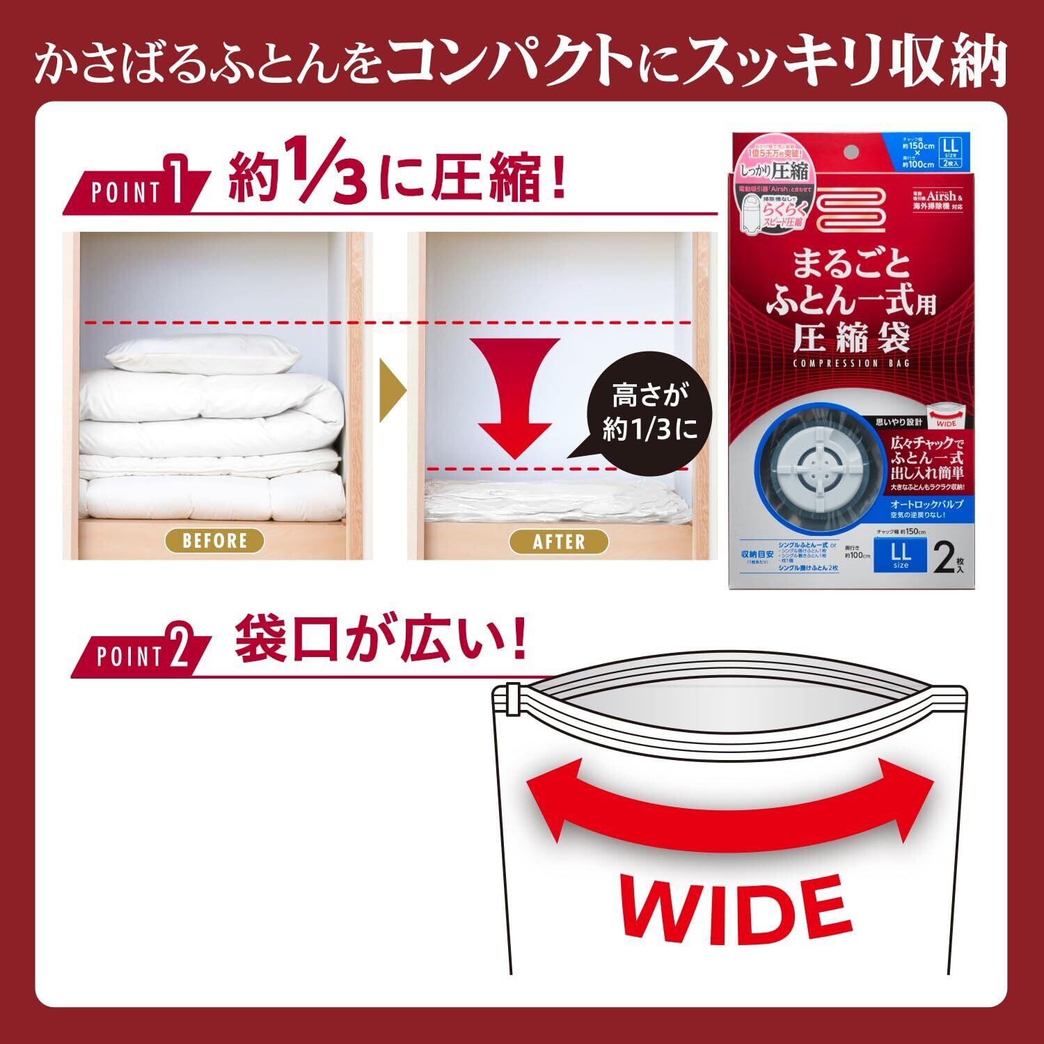 ・電動吸引機(エアッシュ)&海外掃除機対応・オートロックバルブなので、ノズルをあてるだけで簡単に圧縮でき空気の逆戻りがありません。・広々チャックで出し入れ簡単。