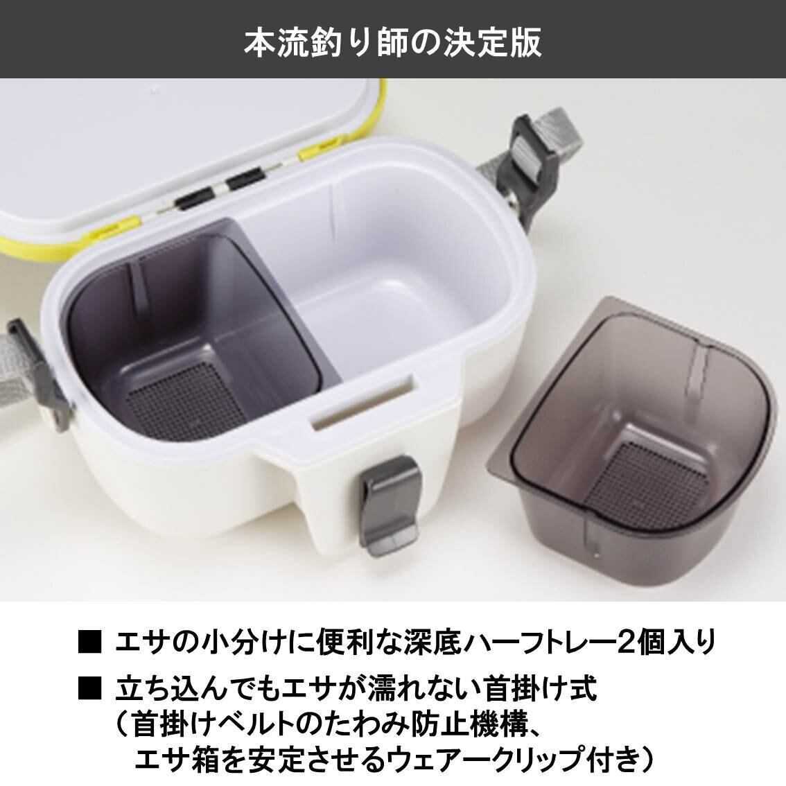 クールベイト 3 PRO●エサの小分け使用時に便利な「ちょい置き(マット付き)トレー」付き●立ち込んでもエサが濡れない首掛け式(首掛けベルトのたわみ防止機構、エサ箱を安定させるウェアークリップ付き)●エサの小分けに便利な深底ハーフトレイ2個入り