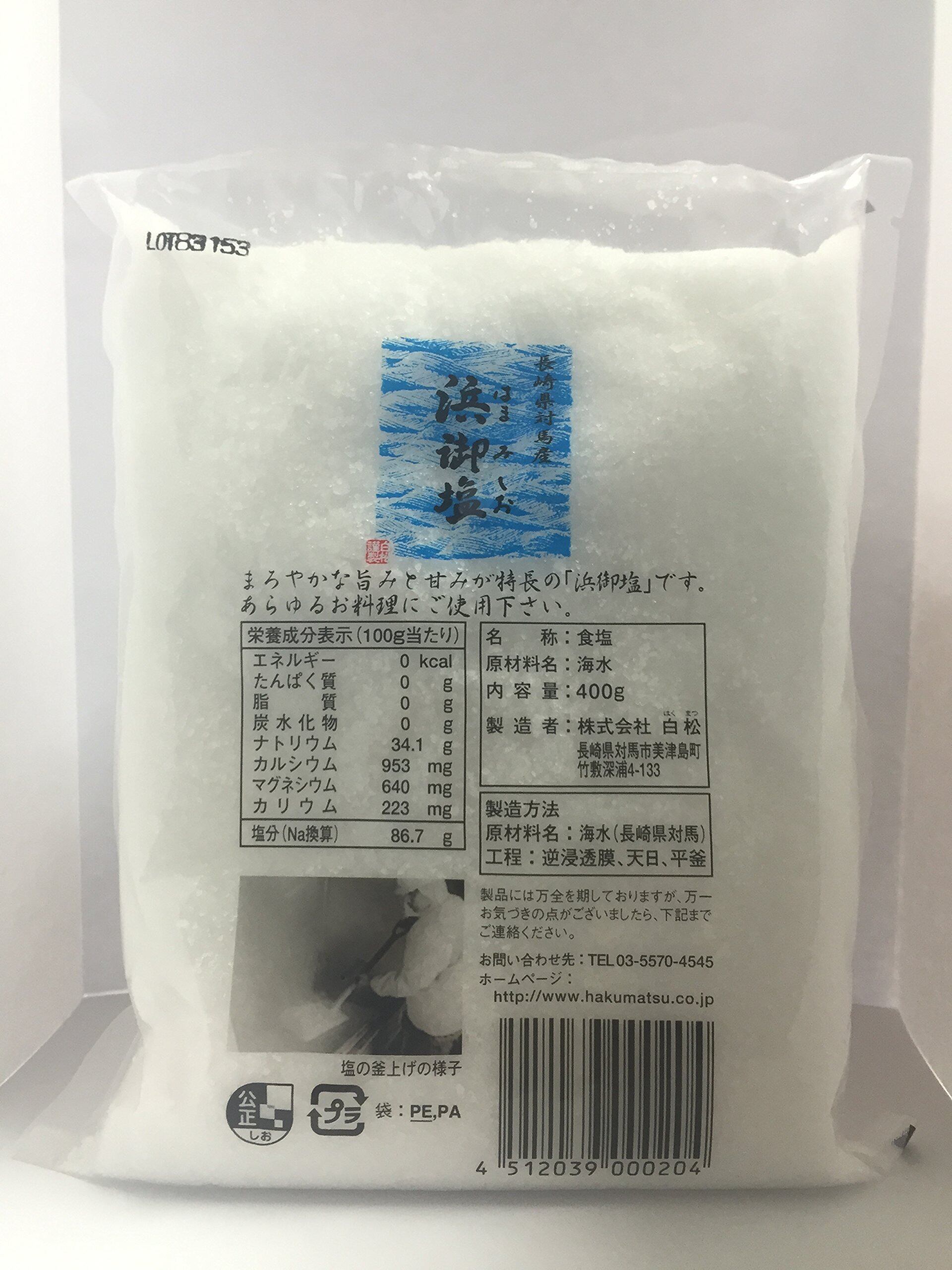 ◆「浜御塩」は、塩職人によるこだわりの海水平釜炊きのお塩です。 長崎県対馬の海岸は、壱岐対馬国定公園に認定され、天然の海藻が生い茂る清麗なる海水に恵まれています。「浜御塩」は、この対馬海流の海水を汲み上げ、濃縮・結晶化させて塩作りを行なっています。 まず最初に、汲み上げた海水を、逆浸透膜を利用した海水濃縮設備で濃度を上げます。次に天日と風の力を利用したネット噴霧式の海水濃縮設備で海水の濃度を上げていきます。さらに、塩職人が平釜で一昼夜煮つめながら塩の結晶化をさせます。結晶化した塩を絶妙のタイミングで、丁寧にざるに取り上げ、水分を切り、仕上げました。 ◆しっとりしたタイプの粗塩で、和食全般にお薦めです。 旨味とかすかな甘味すら感じる「浜御塩」は、和食全般にお薦めです。特に、焼き魚、おにぎり、煮物、漬物などにお薦めです。
