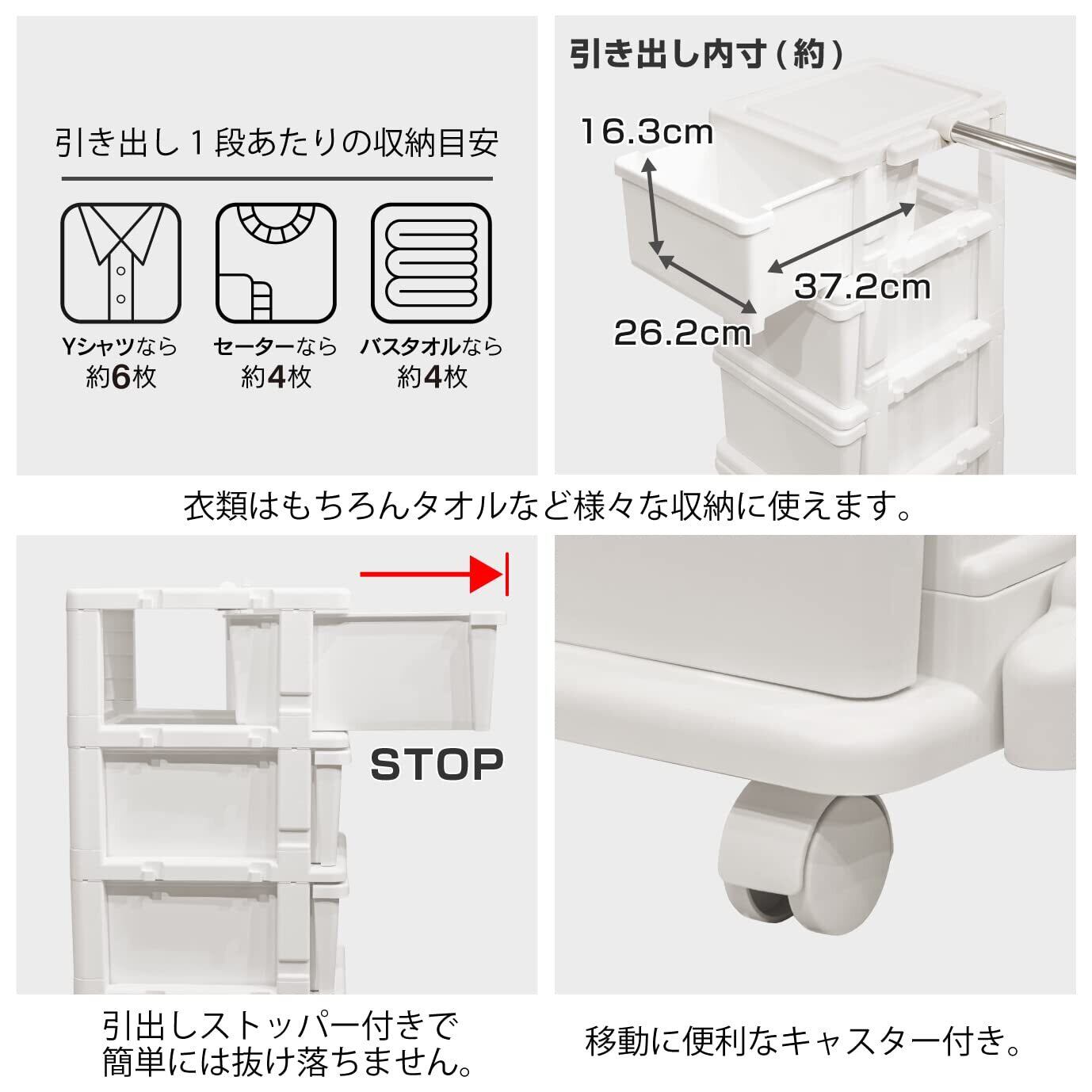 ●1段あたり収納目安=Yシャツなら約6枚、セーターなら約4枚、バスタオルなら約4枚