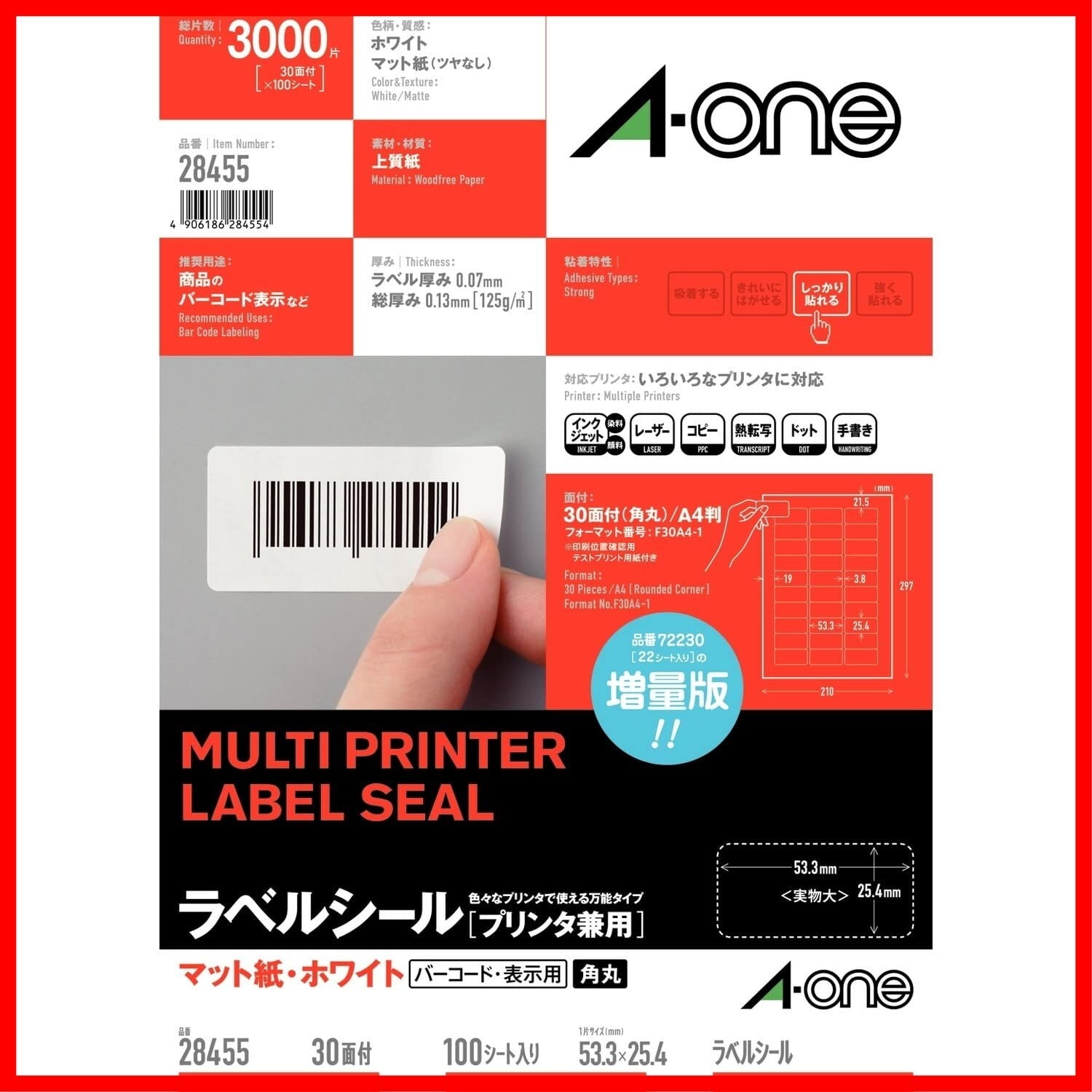 【製品情報】シートサイズ: A4判 (210mm×297mm) / 色: ホワイト / 質感: マット紙 / ラベルサイズ: 53.3×25.4mm (3列×10段) 30面 / 入り数: 100シート(3000枚分) / ラベル厚み: 0.07mm